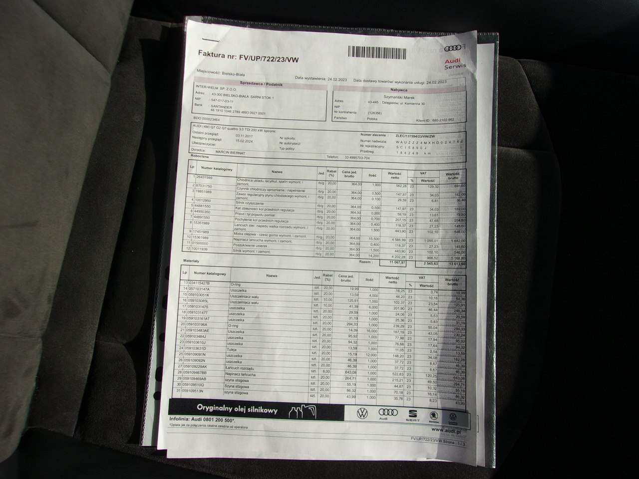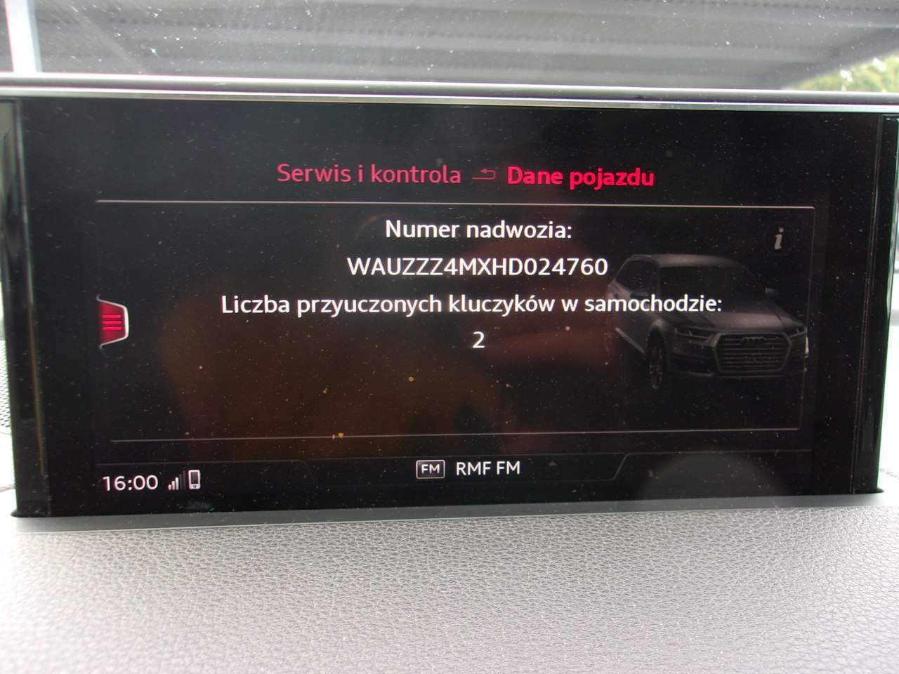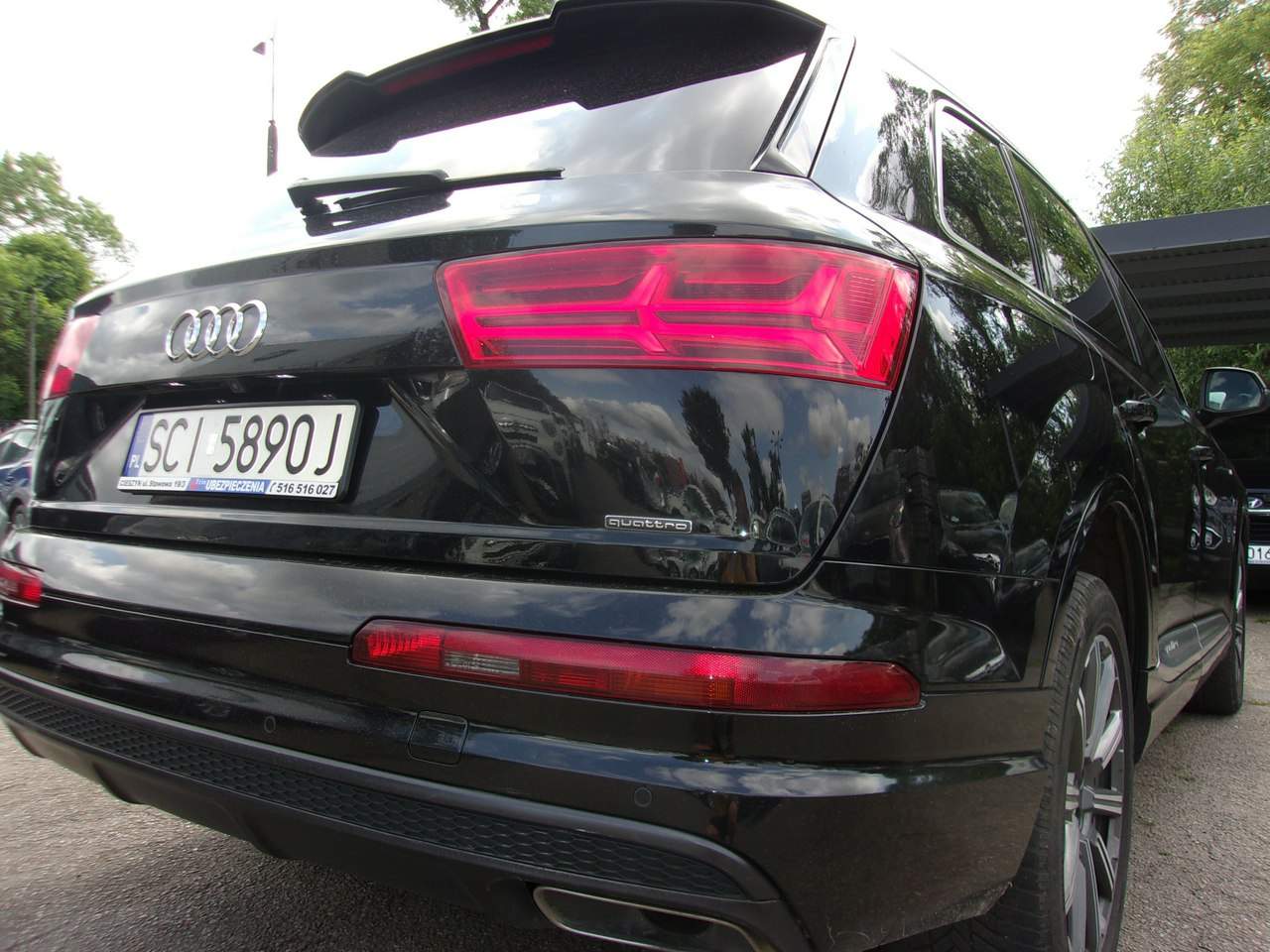 SAMOCHÓD NA ŻYCZENIE KLIENTA MOŻE BYĆ PODDANY OPINII RZECZOZNAWCY, ORAZ NA PROŚBĘ I KOSZT KUPUJĄCEGO MOŻLIWA WIZYTA NA STACJI KONTROLI POJAZDÓW, BĄDŹ W AUTORYZOWANYM SERWISIE. OFERUJEMY RÓWNIEŻ TRANSPORT ZAKUPIONEGO SAMOCHODU WE WSKAZANE MIEJSCE ! WYSTAWIAM FAKTURĘ VAT-MARŻA - KUPUJĄCY ZWOLNIONY Z OPŁATY SKARBOWEJ 2% MOŻLIWOŚĆ WYKUPU ROCZNEJ GWARANCJI GETHELP! NOWY ROZRZĄD, ZMIENIONY W ASO AUDI BIELSKO-BIAŁA!! Audi Q7 3.0 TDi Quattro Rok produkcji: 2016 Data pierwszej rejestracji: 15/11/2016 Wyposażenie: Rodzaj paliwa: Diesel Moc: 200 kW / 272 KM Pojemność: 2 967 ccm Skrzynia biegów: Automatyczna skrzynia biegów Rodzaj nadwozia: SUV Kluczyki: 2 Uszkodzony: Nie Kraj pochodzenia: PL Klasa środowiskowa: EURO 6 Siedzenia: 7 Kolor: Czarny (Oryginalny) Tapicerka: Alcantara (Oryginalny) Liczba drzwi: 5 Emisja CO2: 153g/km Podgrzewane siedzenia Podgrzewane przednie siedzenia Regulowane siedzenia Fotele przednie elektrycznie regulowane, lewy z pamięcią System wspomagania parkowania Kamera cofania Układ kierowniczy ze wspomaganiem Elektryczne wspomaganie kierownicy System Hands-free Przygotowanie do telefonu komórkowego z interfejsem Bluetooth System nawigacji Multi-Media-Interface MMI Navigation Plus z MMI Touch Poduszki powietrzne Poduszka powietrzna kierowcy / Poduszka powietrzna pasażera Przednia poduszka powietrzna boczna Boczna poduszka powietrzna tylna System poduszek powietrznych dla głowy (Sideguard) Klimatyzacja Automatyczna klimatyzacja 4 strefy Filtr cząstek stałych DPF / FAP Filtr cząstek stałych ESP Elektroniczny system stabilizacji (ESC) Immobilizer Elektroniczny immobilizer Napęd na cztery koła Typ układu napędowego: napęd na wszystkie koła System multimedialny Multi-Media-Interface MMI basic Plus / MMI Radio Plus Rozstaw osi 2994 mm Nadwozie: 5 drzwi Zestaw naprawczy opon Silnik 3.0 Ltr. - 200 kW V6 24V TDI CAT (CRTC) Silnik 3.0 L - 200 kW V6 24V TDI Pakiet dla niepalących Pakiet Brilliance System antyzanieczyszczeniowy standardu Euro 6 Wewnętrzne lusterko wsteczne z automatycznym autorefleksem Audi connect (podstawowa usługa internetowa) Progi boczne (aluminium) i ochronne listwy progów przedziału bagażowego (stal) Elektryczne pokrycie przestrzeni ładunkowej Cyfrowa deska rozdzielcza (Audi wirtualny kokpit) Pakiet asystenta parkowania Pakiet oświetleniowy Tapicerka siedzeń: Skóra syntetyczna / skóra Tapicerka sufitu materiałowa, czarna Zasłona przeciwsłoneczna na tylnej szybie + Boczne okno mechaniczne Automatyczna skrzynia biegów - Tiptronic (8 biegów) Projektor LED Tylne lampy LED System wspomagania jazdy: asystent parkowania Reling dachowy (aluminium) Podzielona/składana oparcie tylnej kanapy 3. rząd siedzeń, Składane indywidualne siedzenie (2 siedzenia) Przedni centralny podłokietnik Wyposażenie komfortowe Zielone termoizolacyjne okna Audi connect (System pomocy i alarmowy) Czujnik światła i deszczu Spoiler dachowy Zewnętrznie regulowany, ogrzewany i składany zewnętrzny lusterko zewnętrzne z automatyczną funkcją przeciwsłoneczną i pamięcią Prawe lusterko boczne z pozycją cofania System kontroli prędkości (tempomat) Perłowa farba System Start/Stop Regulacja pionowa/długa kolumny kierowniczej (kierownica) Kierownica (sportowa/skórzana - 3 ramiona) z wielofunkcyjnością System mycia reflektorów (myjka reflektorów) Audi Drive Select Dynamiczne zawieszenie Zaczepy Isofix do fotelika dziecięcego na fotelu pasażera i tylnej kanapie System wspomagania kierowcy: Asystent świateł drogowych System wspomagania jazdy: Asystent startu (asystent utrzymania) Asystent jazdy: System ochrony pasażerów (Audi pre sense basic) Klucz komfortowy z odblokowaniem tylnej klapy sterowanym czujnikiem, w tym (otwarcie + zamknięcie) Możliwość zakupu na raty! Nasz Partner Firmowy: Tomasz Puczek - specjalista ds. kredytów oraz leasingów (msleasing) tel: 451 233 605 Decyzja kredytowa nawet do 2 godzin! ZAPRASZAMY! Niniejsze ogłoszenie jest wyłącznie informacją handlową i nie stanowi oferty w myśl art. 66, §1 Kodeksu Cywilnego. Sprzedający nie odpowiada za ewentualne błędy lub nieaktualność ogłoszeń. i00586246415i