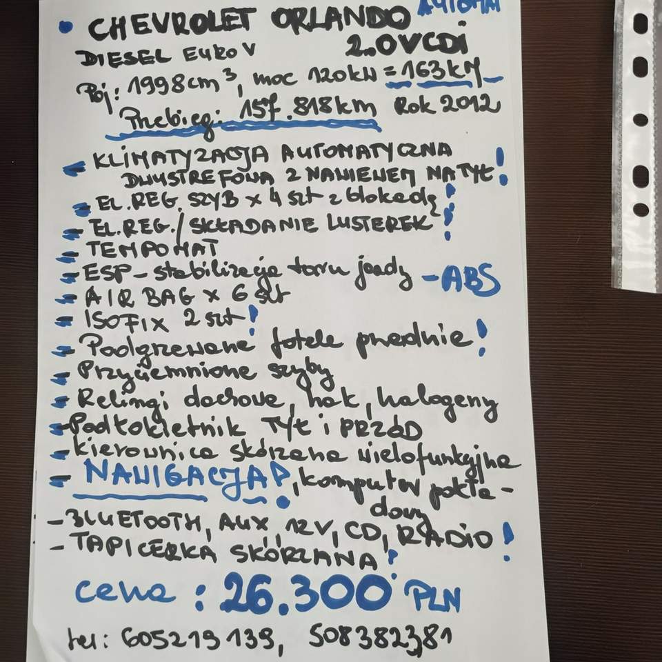 WITAM PAŃSTWA SERDECZNIE I ZAPRASZAM DO ZAPOZNANIA SIĘ Z OFERTĄ SAMOCHODU JAKIM JEST 7-OSOBOWY MINIVAN CHEVROLET ORLANDO Z ROKU 2012 Z SILNIKIEM DIESLA 2.0 VCDI EURO V SAMOCHÓD ZOSTAŁ NIEDAWNO SPROWADZONY Z DANI I PO PRZEGLĄDZIE DIAGNOSTYCZNYM I MECHANICZNYM JEST JUŻ DOSTĘPNY W MYSŁOWICACH OBRZEŻNA PÓŁNOCNA 24 HALA A PIĘKNE AUTO , ŚWIETNIE WYPOSAŻONE , Z PIĘKNĄ ,JAK NOWĄ TAPICERKĄ SKÓRZANĄ SKRZYNIA AUTOMATYCZNA PRACUJĄCA BEZ ZARZUTU , RÓWNIEŻ PO WNIKLIWYM PRZEGLĄDZIE CHEVROLET ORLANDO GOTOWY JEST DO REJESTRACJI! ***POJEMNOŚĆ 1998 cm3 , MOC 163 kM ***PRZEBIEG GWARANTOWANY 157.818 km ***KLIMATYZACJA AUTOMATYCZNA DWUSTREFOWA Z NAWIEWEM NA TYŁ ***EL.REG. SZYB 4 SZT Z BLOKADĄ DLA DZIECI ***EL.REG./SKŁADANIE LUSTEREK ***TEMPOMAT ***ESP STABILIZACJA TORU JAZDY ***ABS , ASR ***AIR BAG 6 SZT ***ISOFIX 2 SZT ***PODGRZEWANE FOTELE PRZEDNIE ***REGULACJA WYSOKOŚCI FOTELI PRZEDNIOCH ***NAWIGACJA ***PDC CZUJNIKI PARKOWANIA TYŁ ***PRZYCIEMNIONE SZYBY ***RELINGI DACHOWE , HAK , HALOGENY ***PODŁOKIETNIK TYŁ I PRZÓD ***KIEROWNICA SKÓRZANA WIELOFUNKCYJNA ***WSPOMAGANIE KIEROWNICY ***CENTRALNY ZAMEK ***BLUETOOTH , AUX , 12V , CD ***KOMPUTER POKŁADOWY , EKRAN DOTYKOWY ***TAPICERKA SKÓRZANA *****CENA 26.300 PLN ZAWIERA KOMPLET OPŁAT DO REJESTRACJI NIE ZWLEKAJ , ŁAP WYJĄTKOWĄ OKAZJĘ ZOSTANIA NOWYM WŁAŚCICIELEM TEGO WYBRANEGO MODELU TEL DO KONTAKTU 605 219 139 LUB 508 382 381 ZAPRASZAMY SERDECZNIE NA JAZDĘ PRÓBNĄ I OGLĘDZINY Numer oferty: AKL18HWGJ i00586868340i