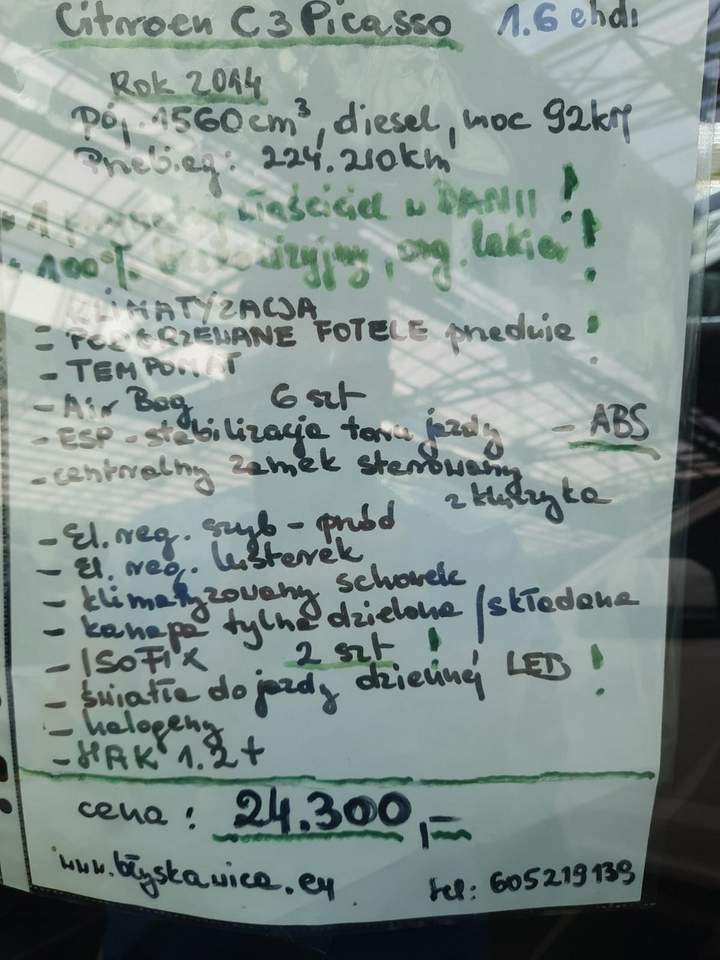 *****PROMOCJA ŚWIĄTECZNA***** *****PRZY ZAKUPIE -400 PLN W DÓŁ!***** Witam serdecznie Państwa i zapraszam do zapoznania się z ofertą samochodu osobowego marki Citroen C3 Picasso. Samochód wyprodukowany w roku 2014,o pojemności 1560cm3,mocy 92kM,w dieslu, emisja spalin Euro V. Świeżo sprowadzony z Danii. ZAWIERA KPL OPŁAT DO REJESTRACJI! Posiada oryginalny lakier na całej karoserii,jest w 100% BEZKOLIZYJNY! Od nowości jeden prywatny właściciel. Samochód dbany , serwisowany, bardzo dobrze prezentujący się w środku,jak i na zewnątrz. Po wnikliwym przeglądzie na stacji diagnostycznej wymienione zostały na nowe tarcze hamulcowe przednie, został przeprowadzony serwis klimatyzacji,oraz została wykonana pełna regeneracja DPF-u i wymieniony płyn Eolys. Niskie zużycie paliwa ,średnio około 4 ,5-5,5/100km. Pojemny bagażnik ! Przestronne wnętrze, bardzo dobrze wyprofilowane siedzenia kierowcy i pasażera, nie obciążające podczas dłuższych podróży odcinka lędźwiowego kręgosłupa. Nowoczesny design, łatwość prowadzenia auta , jego zrywność i ekonomiczność czynią go IDEALNYM AUTEM dla osoby lubiącej wygodę ,styl i klasę. Cena 22.250 PLN ZAPRASZAM NA JAZDĘ PRÓBNĄ! ***KLIMATYZACJA*** ***PODGRZEWANE FOTELE PRZEDNIE*** ***TEMPOMAT*** ***AIR BAG 6 SZT*** ***ESP STABILIZACJA TORU JAZDY*** ***ABS*** ***CENTRALNY ZAMEK STEROWANY Z KLUCZYKA*** ***EL.REG.SZYB PRZÓD*** ***EL.REG.LUSTEREK*** ***KLIMATYZOWANY SCHOWEK*** ***KANAPA TYLNA DZIELONA/SKŁADANA*** ***ISOFIX 2 SZT*** ***ŚWIATŁA DO JAZDY DZIENNEJ LED*** ***HALOGENY*** ***HAK 1.2t*** Samochód do obejrzenia Mysłowice Obrzeżna Północna 24 HALA A tel 605219139 Gdybym nie odbierał telefonu proszę o wiadomość sms -oddzwonię Nie zwlekaj! Łap okazję! Ten wyjątkowy samochód czeka na Ciebie! Numer oferty: AKL18ZPZF i00585952490i