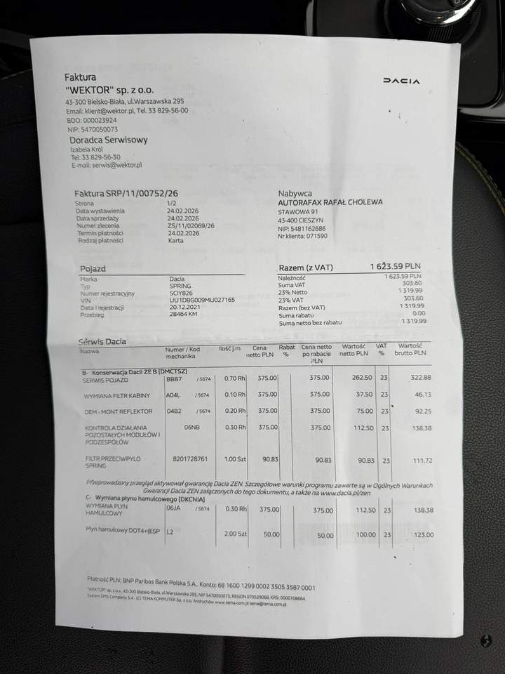 Dacia Spring - miejski elektryk! Samochód regularnie serwisowany w ASO - Wektor Bielsko-Biała Gwarancja na akumulatory do 2029 roku! Faktura VAT 23% – kupujący zwolniony z opłaty skarbowej 2%. Najważniejsze wyposażenie: - Klimatyzacja - Tapicerka skórzana - Elektryczne szyby przednie - Komputer pokładowy - Czujniki parkowania - Kamera cofania Dostępna opcja finansowania – kredyt lub leasing. Decyzja kredytowa nawet w 2 godziny. Kontakt do doradcy: Tomasz Puczek – msleasing, tel. 451 233 605 Niniejsze ogłoszenie jest wyłącznie informacją handlową i nie stanowi oferty w myśl art. 66, §1 Kodeksu Cywilnego. Sprzedający nie odpowiada za ewentualne błędy lub nieaktualność ogłoszeń. i00586620305i