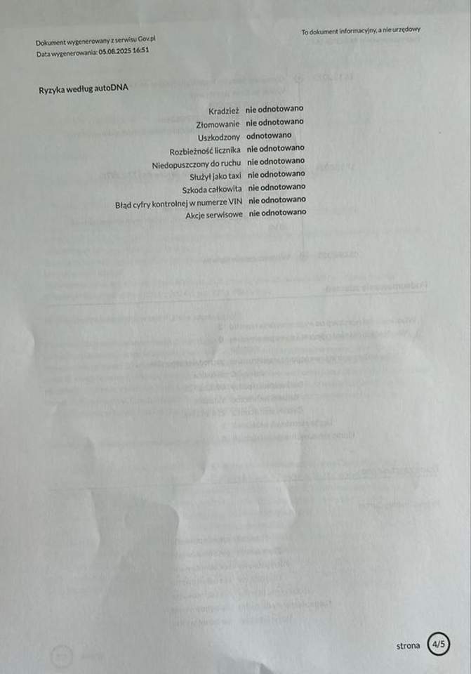 DS 5 2.0 BlueHDi 150KM | Skóra + Alcantara | Panorama | Navi | Czujniki Parkowania | Klimatronic • Faktura VAT Marża – kupujący zwolniony z opłaty PCC – oszczędność 870 PLN • Sprzedaż na zlecenie klienta - auto od osoby prywatnej • Bardzo dobrze utrzymany i wyposażony • Pochodzenie - Francja (2 właścicieli w PL od 2021) • Możliwość dokupienia rocznej gwarancji Gethelp Technologia, komfort i wyposażenie DS 5 z 2016 roku to wyjątkowy model, który łączy francuską elegancję, nowoczesną technologię i niepowtarzalny design. Auto oferuje wysoki poziom komfortu i dopracowaną jakość wykończenia, typową dla segmentu premium. Dzięki dynamicznej sylwetce i nietuzinkowemu wnętrzu zainspirowanemu kokpitem samolotu, DS 5 wyróżnia się na tle innych kompaktów. Prezentowany egzemplarz wyposażony jest w oszczędny, a zarazem dynamiczny silnik 2.0 BlueHDi o mocy 150 KM, współpracujący z 6-biegową manualną skrzynią. Bogate wyposażenie obejmuje m.in. system nawigacji GPS, rozbudowane multimedia, czujniki parkowania przód i tył, skórzano-materiałowe fotele, dwustrefową klimatyzację automatyczną oraz elektryczny hamulec postojowy. Wybrane elementy wyposażenia • Fotele przednie skórzane z Alcantarą, o komfortowym wyprofilowaniu i szerokim zakresie regulacji • Kierownica skórzana, wielofunkcyjna • System multimedialny z dotykowym ekranem, nawigacją GPS, Bluetooth, Apple Carplay • Czujniki parkowania przód + tył • System Keyless – bezkluczykowy dostęp oraz uruchamianie silnika przyciskiem Start • Klimatyzacja automatyczna dwustrefowa z osobną regulacją temperatury • Reflektory ksenonowe z funkcją doświetlania zakrętów i automatycznym poziomowaniem • Światła do jazdy dziennej LED + tylne lampy LED • Lusterka boczne elektrycznie sterowane i podgrzewane • Elektryczny hamulec postojowy z funkcją Auto Hold • Przyciemniane szyby tylne (fabryczne) • Stylowa deska rozdzielcza z analogowym zegarem i wykończeniem typu soft touch • Aluminiowe felgi 17” w stylistyce DS • Czarna podsufitka i detale wnętrza w stylu premium Systemy bezpieczeństwa i wspomagania • System stabilizacji toru jazdy (ESP) + kontrola trakcji (TCS) • System wspomagania ruszania pod górę (Hill Assist) • Automatyczne światła (czujnik zmierzchu) • Automatyczne wycieraczki (czujnik deszczu) • Tempomat z ogranicznikiem prędkości • Komplet poduszek powietrznych: czołowe, boczne i kurtynowe Silnik, napęd i skrzynia • Silnik: 2.0 BlueHDi diesel, 150 KM • Moment obrotowy: wysoka elastyczność, niskie spalanie • Skrzynia biegów: manualna, 6-biegowa • Napęd: na przednią oś (FWD) • Aktualne spalanie wg komputera: ok. 6.9 l/100 km Możliwość finansowania – zapytaj o szczegóły! Osoba prywatna zwolniona z opłaty PCC (2%) - oszczędność 870 PLN! Auto dostępne od ręki – zapraszamy do kontaktu i na oględziny! Szukasz innego auta? - Sprowadzimy je dla Ciebie! LET'S GO! Samochody z Gwarancją • OFERUJEMY - samochody używane krajowe i importowane z Europy, również na zamówienie klientów. Auta poleasingowe, kontraktowe i od osób prywatnych, zawsze dokładnie zweryfikowane. • PROGRAMY GWARANCYJNE - dostępne dla wszystkich aut w naszej ofercie, z możliwością dostosowania warunków do Państwa potrzeb. • FINANSOWANIE - leasing, kredyt (również bez BIK) • UBEZPIECZENIA - porównamy oferty większości kluczowych towarzystw i wybierzemy najlepszą! • OGLĘDZINY - udostępnimy miernik lakieru, raport VIN, raport techniczny i dokumentację zdjęciową z momentu zakupu przez nas auta. Wyrażamy zgodę na wizytę w stacji diagnostycznej lub serwisie. • AUTO W ROZLICZENIU - zawsze rozważymy przyjęcie Państwa innego samochodu przy rozliczeniu transakcji. Wycenę i decyzję przedstawimy niezwłocznie po oględzinach i sprawdzeniu pojazdu. • CHCESZ SPRZEDAĆ SWOJE AUTO - wstaw je do naszego komisu. Kompleksowo przygotujemy samochód do sprzedaży, dodamy gwarancje na Państwa auto, zaoszczędzimy czas na telefony i oględziny. Jest też grupa klientów kupująca auta "z placu" • ZAKUP U PROFESJONALNEGO SPRZEDAWCY - transparentność, bezpieczeństwo, pełna ochrona prawna (rękojmia) • WIZYTA W LET'S GO! - możemy się spotkać w każdym dniu tygodnia i o każdej porze, nawet jeśli planują Państwo przyjechać poza oficjalnie podanymi godzinami pracy. Przed wizytą zawsze prosimy o telefon w celu potwierdzenia aktualności oferty! Niniejsze ogłoszenie ma charakter informacyjny i nie stanowi oferty handlowej w rozumieniu art. 66 §1 Kodeksu cywilnego. Numer oferty: AKL18F4WZ i00586342720i