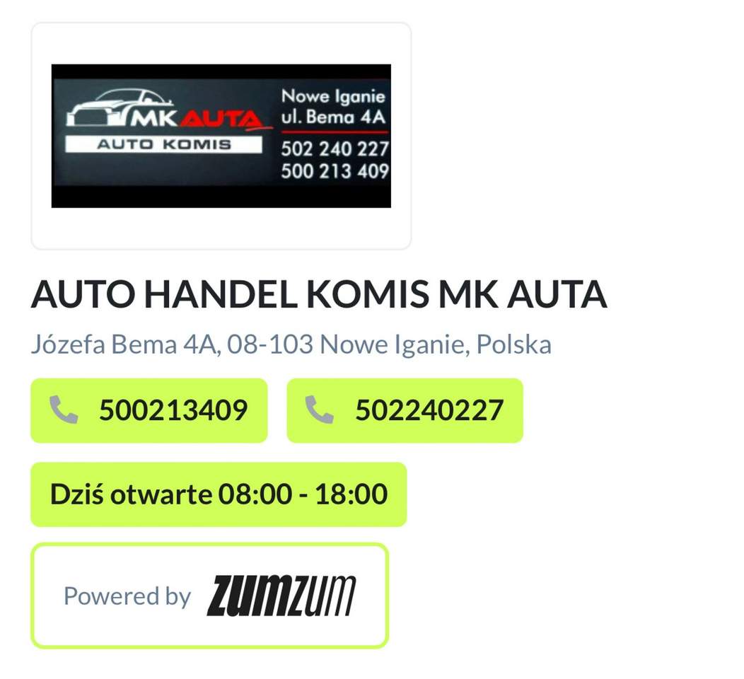 Witam, -Mam do sprzedania bardzo ładne auto -Auto sprowadzone z Niemiec zarejestrowane w Polsce -Mam zdjęcia jak auto wyglądało przed zakupem, auto sprowadzone w całości nie rozbite -auto w super stanie nic nie stuka nic nie puka -zawieszenie ścisłe nie wybite -środek bardzo ładne utrzymane zadbany -silnik pracuje bardzo ładnie cicho i równo -klimatyzacja sprawna -możliwość sprawdzenia auta na dowolnej stacji kontroli czy warsztacie -możliwość odbycia jazdy próbnej auto jest zarejestrowane w Polsce -wystawiam fakturę klient nie płaci 2% opłaty skarbowej koszt rejestracji to tylko 63 zł ====================================================================================== Numer VIN udostępniamy na życzenie klienta zadzwoń napisz do nas wyślemy telefoniczne nr do kontaktu 500 213 409 ====================================================================================== Ten samochód możesz kupić bez wkładu własnego, wszystkie formalności załatwisz podczas jednej wizyty decyzja kredytowa w 30 min. Dogodne warunki zakupu na kredyt z zachowaniem procedury uproszczonej (możliwość skredytowania 100% wartości pojazdu, okres kredytowania od 12 do 96 miesięcy, możliwość wcześniejszej spłaty kredytu) ====================================================================================== Jeśli zjeździłeś wszystkie okazje cenowe z całej Polski i nie kupiłeś auta to przyjedź zobacz a na pewno się nie rozczarujesz i odjedziesz autem. U nas kupisz auto zarejestrowane w Polsce na Polskich tablicach co gwarantuje Ci użytkowanie auta od pierwszych chwil i bezpieczny powrót do domu. Mamy w ofercie wiele innych aut zadzwoń zapytaj Pracujemy codziennie 7 dni w tygodniu od 8.00 do 18.00 w późniejszych godzinach po ustaleniu telefonicznym Auto można zobaczyć w okolicach Siedlec dokładny adres poniżej: MK Auta 08-103 Nowe Iganie ul Bema 4a tel 500 213 409 lub 502 240 227 ZAPRASZAM Numer oferty: AKL18HSDJ i00586817101i