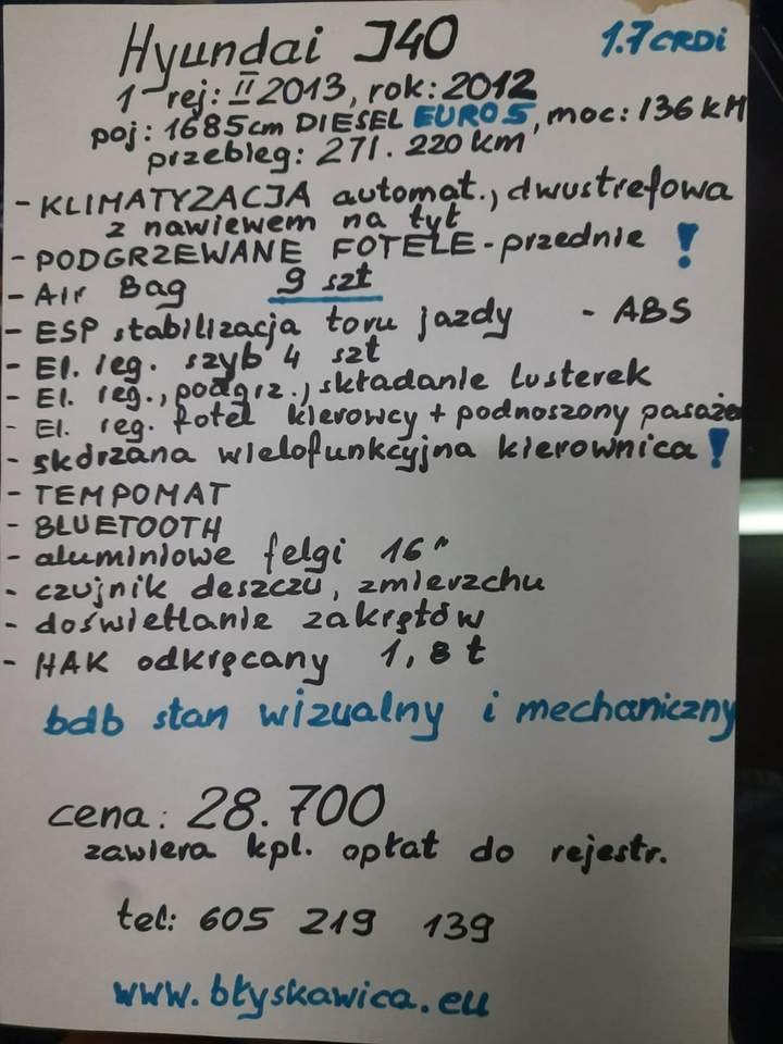 ***PROMOCJA MIESIĄCA*** ***WYPRZEDAŻ -700 PLN W DÓŁ!!! HYUNDAI i40 DIESEL 1.7 CRDi ROK 2012 ***I REJ ROK II 2013*** POJEMNOŚĆ 1685 cm3 MOC 136 kM DIESEL EURO 5 PRZEBIEG GWARANTOWANY 271.220 km ***KLIMATYZACJA AUTOMATYCZNA DWUSTREFOWA Z NAWIEWEM NA TYŁ ***PODGRZEWANE FOTELE PRZEDNIE ***AIR BAG 9 SZT !!! ***ESP STABILIZACJA TORU JAZDY ***ABS ***EL.REG. SZYB 4 SZT ***EL.REG. PODGRZEWANIE I SKŁADANIE LUSTEREK ***EL.REG. FOTELA KIEROWCY ***PODNOSZONY GÓRA DÓŁ FOTEL PASAŻERA ***KIEROWNICA SKÓRZANA WIELOFUNKCYJNA ***TEMPOMAT ***BLUETOOTH ***ALUMINIOWE FELGI 16' ***CZUJNIK DESZCZU ***CZUJNIK ZMIERZCHU ***DOŚWIETLANIE ZAKRĘTÓW ***HAK ODKRĘCANY 1,8 t *****BARDZO DOBRY STAN MECHANICZNY I WIZUALNY SAMOCHODU!!!***** CENA 27.900 PLN ZAWIERA KPL OPŁAT DO REJESTRACJI *****ŚWIEŻO SPROWADZONY Z DANII***** ZAPRASZAM PAŃSTWA SERDECZNIE DO ZAPOZNANIA SIĘ Z OFERTĄ SAMOCHODU JAKIM JEST HYUNDAI i40 Z ROKU 2012 ,NATOMIAST JEGO PIERWSZA REJESTRACJA PRZYPADA NA II 2013!!! SAMOCHÓD PIĘKNIE PREZENTUJĄCY SIĘ W ŚRODKU JAK I NA ZEWNĄTRZ POSIADA BOGATE WYPOSAŻENIE, JEST W SUPER STANIE MECHANICZNYM ! NIE BĘDZIE WYMAGAŁ W NAJBLIŻSZYM CZASIE ŻADNYCH NAKŁADÓW FINANSOWYCH TEN WYJĄTKOWY EGZEMPLARZ DO ZOBACZENIA MYSŁOWICE OBRZEŻNA PÓŁNOCNA 24 HALA A TELEFON KONTAKTOWY 605 219 139 gdybym nie odbierał telefonu proszę o wiadomość sms -oddzwonię NIE ZWLEKAJ ! ŁAP OKAZJĘ ! UMÓW SIĘ JUŻ DZIŚ NA JAZDĘ PRÓBNĄ ! *****ZAPRASZAM***** Numer oferty: AKL18FHMS i00586242218i