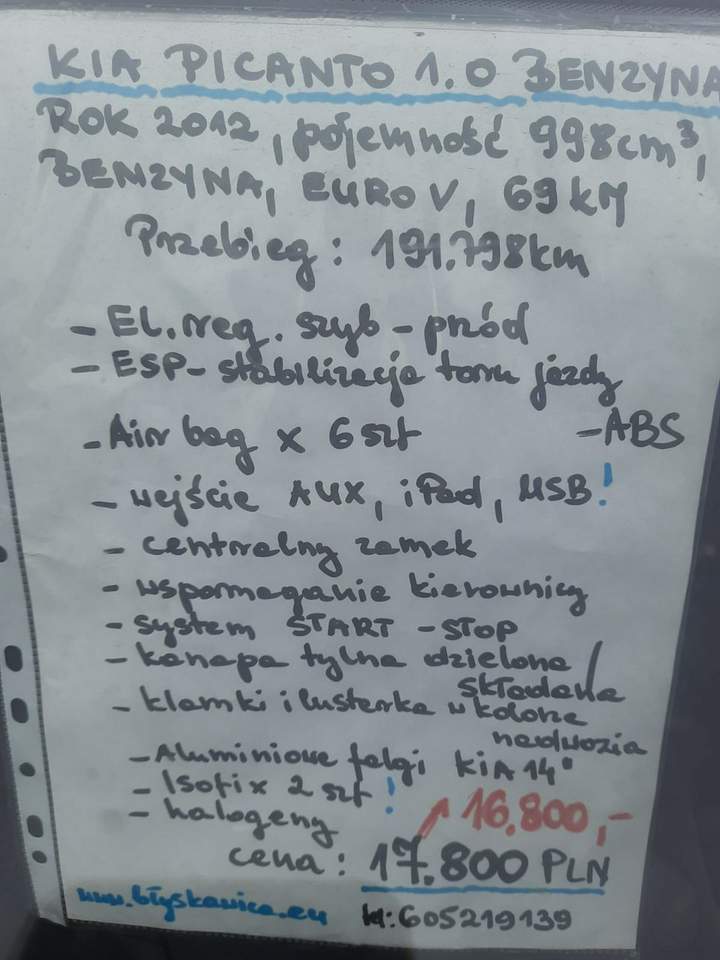 ***WYPRZEDAŻ ROCZNIKA*** ***PRZY ZAKUPIE AUTA 700 PLN W DÓŁ!!! ***KIA PICANTO 1.9 BENZYNA ROK 2012 *****ZAKONSERWOWANY JAKO NOWY W ROKU 2012!***** *****NOWY AKUMULATOR BOSCH***** POJEMNOŚĆ 998 cm3 , MOC 69 kM , EMISJA SPALIN EURO V PRZEBIEG GWARANTOWANY 191.798 km ***EL.REG.SZYB PRZEDNICH ***ESP STABILIZACJA TORU JAZDY ***ABS ***AIR BAG 6 SZT ***WEJŚCIE AUX , USB , iPAD ***CENTRALNY ZAMEK ***WSPOMAGANIE KIEROWNICY ***SYSTEM START STOP ***KANAPA TYLNA DZIELONA / SKŁADANA ***KLAMKI I LUSTERKA W KOLORZE NADWOZIA ***ALUMINIOWE FELGI KIA 14" ***ISOFIX 2 SZT ! ***HALOGENY CENA 16.600 PLN ZAWIERA KPL OPŁAT DO REJESTRACJI ZAPRASZAM SERDECZNIE PAŃSTWA DO ZAPOZNANIA SIĘ Z OFERTĄ SAMOCHODU JAKIM JEST KIA PICANTO Z ROKU 2012. SAMOCHÓD ZOSTAŁ ZAKONSERWOWANY JAKO NOWY W ROKU 2012! JEST TO MIEJSKIE ,FAJNE AUTKO ,JAK I RÓWNIEŻ EKONOMICZNE Z EMISJĄ SPALIN EURO V JEŚLI SZUKASZ SAMOCHODU ,KTÓRYM WSZĘDZIE WJEDZIESZ I ZAPARKUJESZ ,A ZARAZEM MA BYĆ WYGODNY I PRZESTRONNY , TO JEST TO IDEALNY WYBÓR ! SAMOCHÓD NIE WYMAGA ŻADNYCH NAKŁADÓW FINANSOWYCH KIA PICANTO DO OGLĄDNIĘCIA MYSŁOWICE OBRZEŻNA PÓŁNOCNA 24 PLAC PRZED HALĄ A TEL DO KONTAKTU 605 219 139 lub 508 382 381 gdybym nie odbierał telefonu proszę o wiadomość sms oddzwonię ZAPRASZAM UMÓW SIĘ JUŻ DZIŚ NA JAZDĘ PRÓBNĄ, NIE ZWLEKAJ ,ŁAP WYJĄTKOWĄ OKAZJĘ ! Numer oferty: AKL18FK18 i00586256609i