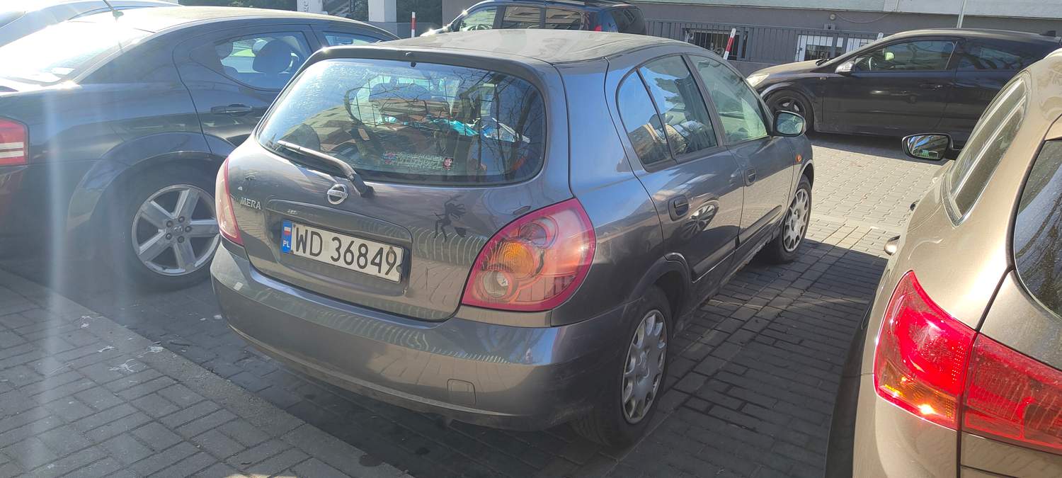 Nissan Almera. Kupiony w salonie Gajewskiego - Warszawa Bielany, rejestrowany na 4 osoby jako ciężarowy - z kratką za tylnym siedzeniem. Sewisowany regularnie do ok 2020, do kiedy funkcjonował macierzysty serwis, potem co najmniej raz w roku płyny i co potrzeba, lub częściej gdy okazjonalnie coś się działo np z imobilaizerem, ale już w różnych warsztatach. Ubezpieczenie do maja, przegląd do września. Od jesieni nie więcej jak 2000 przebiegu. Brudny i z dziurawymi progami. Na jesieni miał je ktoś odnowić, ale poszedł w tango... W 2025 przed przeglądem naprawiany immobilaizer i zmieniony akumulator na Bosha. Almerze potrzeba zaopiekowania i przede wszystkim wymiany, lub nakładek progów. Ma szansę jeszcze się odwdzięczyć, bo to niezawodny ale ostatnio praktycznie nie używany japończyk.