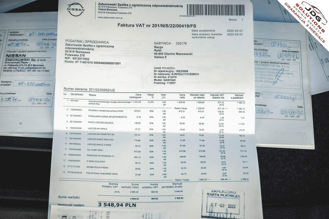 Witam Przedstawiam Państwu ciekawą ofertę sprzedaży bardzo atrakcyjnego, pożądanego i niezawodnego miejskiego crossovera jakim niewątpliwie jest prezentowany NISSAN QASHQAI 1.2 DIG-T 115KM, w pięknym, modnym bordowo-perłowym kolorze. Czemu uważam, że jest to oferta warta zainteresowania ? Mianowicie cena auta z takim przebiegiem jest jedną z niższych w kraju, auto pochodzi z polskiego salonu, jest bezwypadkowe a co najważniejsze jest w bardzo dobrym stanie technicznym, co ma kluczowe znaczenie w przypadku kilkunastoletnich samochodów. Wartością dodana jest również fakt, że od nowości Nissan miał tylko i wyłącznie jednego właściciela, co mogę udowodnić w trakcie oględzin auta. Qashqai jest idealnym wyborem zarówno dla rodziny, jak i osób poszukujących komfortowego samochodu do codziennego użytkowania. Nissan od lat charakteryzuje się solidną konstrukcją, wysokim poziomem bezpieczeństwa oraz ponadczasową stylistyką marki , dlatego jest tak chętnie wybieranym modelem auta. Chciałbym wyraźnie zaznaczyć, że w mojej ocenie auto jest bardzo ładnie utrzymane szczególnie pod kątem stanu wnętrza jak i ogólnego wyglądu powłoki lakierniczej, która nie ma znaczących rys ani uszkodzeń lakieru, które mogłyby denerwować oko nowego właściciela. Do sprzedawanego Qashqaia posiadam komplet dokumentów i kluczyków w tym książkę serwisową prowadzoną do kńca oraz jestem gotowy dać pisemną gwarancję przebiegu, który obecnie wynosi jedynie 151tys.km. Na życzenie zdecydowanego klienta jestem skłonny umówić się na wizytę w dowolnym serwisie ASO wskazanym przez kupującego. Ze względu na to , że auto przez długi okres było pod opieką autoryzowanych stacji , zapewniam Państwa, że jazda nim daje dużo satysfakcji, wygody i poczucia bezpieczeństwa. Oceniając stan techniczny Nissana mogę zapewnić, że na obecną chwilę nie wymaga on żadnych dodatkowych nakładów finansowych, gdyż auto jest przygotowane do dalszej, długiej eksploatacji - w niedawnym czasie został wymieniony kompletny rozrząd, olej silnikowy, tarcze oraz klocki hamulcowe. Silnik pracuje bez zarzutów, nie ma również śladów wycieków (ani z góry, ani od spodu) co potwierdziłem osobiście podczas niedawnej wizyty na stacji diagnostycznej. Jak już wcześniej nadmieniłem auto napędzane jest benzynowym silnikiem 1.2 DIG-T 115KM, który charakteryzuje się dobrą dynamiką, elastycznością i umiarkowanym zużyciem paliwa na poziomie 6,2l/100km. UWAGA !!! NA SPRZEDAWANE AUTO UDZIELAM 3 MIESIĄCE PISEMNEJ GWARANCJI WYSTAWIONEJ PRZEZ FIRMĘ „ JDG SOLUTIONS DOMINIK GRACZYK” ZAPRASZAM RÓWNIEŻ DO ZAPOZNANIA SIĘ Z OPINIAMI KLIENTÓW DOSTĘPNYMI W SERWISIE GOOGLE MAPS - https://www.google.com/search?q=jdg+solutions+dominik+graczyk+opinie INFORMUJĘ RÓWNIEŻ O MOŻLIWOŚCI ZAKUPU AUTA W BARDZO KORZYSTNYCH RATACH !!!! Drodzy Państwo jeżeli szukacie sprawdzonego, bezwypadkowego auta o znanej historii, uczciwym i udokumentowanym przebiegu, zachęcam do oglądania i odbycia jazdy próbnej w miejscowości Konary (05-088 Brochów) koło Sochaczewa. Informuję również , że jest możliwość weryfikacji stanu auta, na dowolnej stacji diagnostycznej lub serwisie ASO wskazanym przez kupującego. Pozdrawiam i zapraszam do zakupu jednocześnie zapewniając, że mój opis jest w pełni wiarygodny i odzwierciedla realny stan sprzedawanego auta. Więcej informacji pod nr telefonu wskazanym w ogłoszeniu , w przypadku kiedy nie będę mógł odebrać, proszę o kontakt sms, a zapewniam że oddzwonię możliwie jak najszybciej. Numer oferty: AKL18HSBV i00586816385i