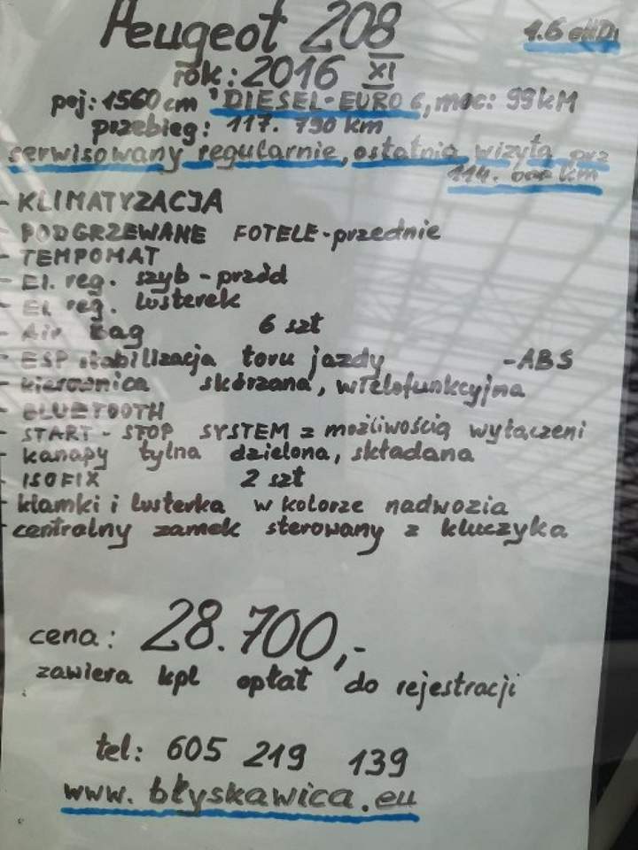 PEUGEOT 208 ROK 2016 DIESEL EURO VI POJEMNOŚĆ 1560cm3 MOC 99kM , 1.6 eHDi PRZEBIEG 117.790km REGULARNIE SERWISOWANY,OSTATNIA WIZYTA PRZY PRZEBIEGU 114.000km WITAM PAŃSTWA I ZAPRASZAM DO ZAPOZNANIA SIĘ Z OFERTA SAMOCHODU JAKIM JEST PEUGEOT 208 Z ROKU 2016 JEST TO AUTO REGULARNIE SERWISOWANE, ZADBANE,Z CZYSTYM WNĘTRZEM SAMOCHÓD W STANIE IDEALNYM POD WZGLĘDEM MECHANICZNYM I WIZUALNYM MA UDOKUMENTOWANY PRZEBIEG FAJNE AUTKO, DOBRZE PROWADZĄCE SIE , EKONOMICZNE POSIADA KLIMATYZACJĘ , BLUETOOTH DESKA ROZDZIELCZA PREZENTUJE SIE W TYM MODELU WYJĄTKOWO DOBRZE AUTO JEST WYGODNE ,FOTELE DOBRZE WYPROFILOWANE CO JEST WAŻNĄ RZECZĄ TO JEGO EKONOMIA , ŚREDNIE SPALANIE RZĘDU 4,5 -5,5/100km -KLIMATYZACJA - PODGRZEWANE FOTELE PRZEDNIE -TEMPOMAT -EL.REG.SZYB PRZÓD -EL.REG.LUSTEREK -AIR BAG 6 SZT -ESP -STABILIZACJA TORU JAZDY -ABS -KIEROWNICA SKÓRZANA WIELOFUNKCYJNA -BLUETOOTH -START-STOP SYSTEM Z MOŻLIWOŚCIĄ WYŁĄCZENIA - KANAPA TYLNA DZIELONA , SKŁADANA -ISOFIX 2 SZT -KLAMKI I LUSTERKA W KOLORZE NADWOZIA -CENTRALNY ZAMEK STEROWANY Z KLUCZYKA CENA 27800 PLN ZAWIERA KPL OPŁAT DO REJESTRACJI ŚWIEŻO SPROWADZONY Z DANII MYSŁOWICE OBRZEŻNA PÓŁNOCNA 24 HALA A TEL 605219139 Gdybym nie odbierał telefonu proszę o wiadomość sms -oddzwonię www.błyskawica.eu Numer oferty: AKL18ZDQA i00585897808i