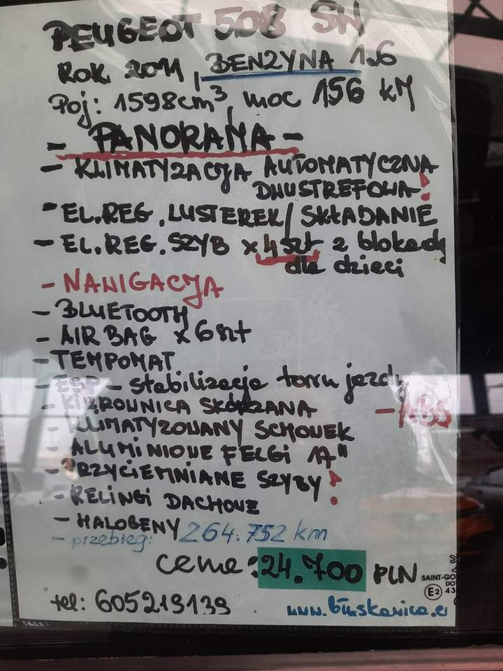 *****PROMOCJA***** *****ZAPYTAJ O RABAT PRZY ZAKUPIE AUTA!***** PEUGEOT 508 SW ROK PRODUKCJI 2011 1.6 BENZYNA *****PANORAMA!!!***** POJEMNOŚĆ 1599 cm3 , MOC 156 Km , PRZEBIEG 264.752 km PANORAMA !!! KLIMATYZACJA AUTOMATYCZNA DWUSTREFOWA EL.REG.LUSTEREK SKŁADANIE LUSTEREK EL.REG.SZYB 4 SZT Z BLOKADĄ DLA DZIECI *****NAWIGACJA *****BLUETOOTH *****AIR BAG 6 SZT *****TEMPOMAT *****ESP-STABILIZACJA TORU JAZDY *****ABS KIEROWNICA SKÓRZANA WIELOFUNKCYJNA KLIMATYZOWANY SCHOWEK ALUMINIOWE FELGI 17" PRZYCIEMNIANE SZYBY RELINGI DACHOWE HALOGENY PDC -CZUJNIKI PARKOWANIA TYŁ I PRZÓD CENA 23.999 PLN ZAPRASZAM PAŃSTWA SERDECZNIE DO ZAPOZNANIA SIĘ Z OFERTĄ SAMOCHODU JAKIM JEST PEUGEOT 508 SW Z ROKU 2011. PIĘKNIE PREZENTUJĄCE SIĘ AUTO W ŚRODKU , JAK I NA ZEWNĄTRZ. SERWISOWANE COROCZNIE ,Z BOGATYM WYPOSAŻENIEM NAWIGACJĄ I KLIMATYZACJĄ AUTOMATYCZNĄ DWUSTREFOWĄ NIESPOTYKANY KOLOR "BIAŁA PERŁA METALIK" , KTÓRA MIENI SIĘ W ZALEŻNOŚCI OD PADAJĄCEGO ŚWIATŁA. JEGO NAJWIĘKSZYM ATUTEM JEST PANORAMICZNY DACH !!! SAMOCHÓD DO OBEJRZENIA MYSŁOWICE OBRZEŻNA PÓŁNOCNA 24 HALA A TEL DO KONTAKTU 605 219 139 lub 508 382 381 ,gdybym nie odbierał telefonu proszę o wiadomość sms -oddzwonię NIE ZWLEKAJ , UMÓW SIĘ NA JAZDĘ PRÓBNĄ JUŻ DZIŚ!!! TEN WYJĄTKOWY ,ELEGANCKI SAMOCHÓD CZEKA NA CIEBIE !!! *****ZAPRASZAM SERDECZNIE***** Numer oferty: AKL18FFFF i00586218823i
