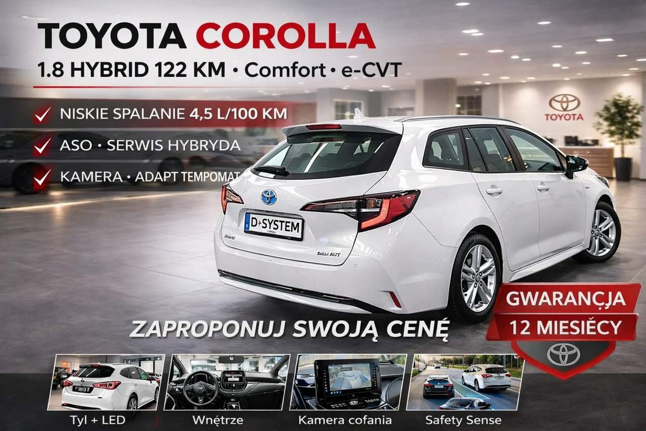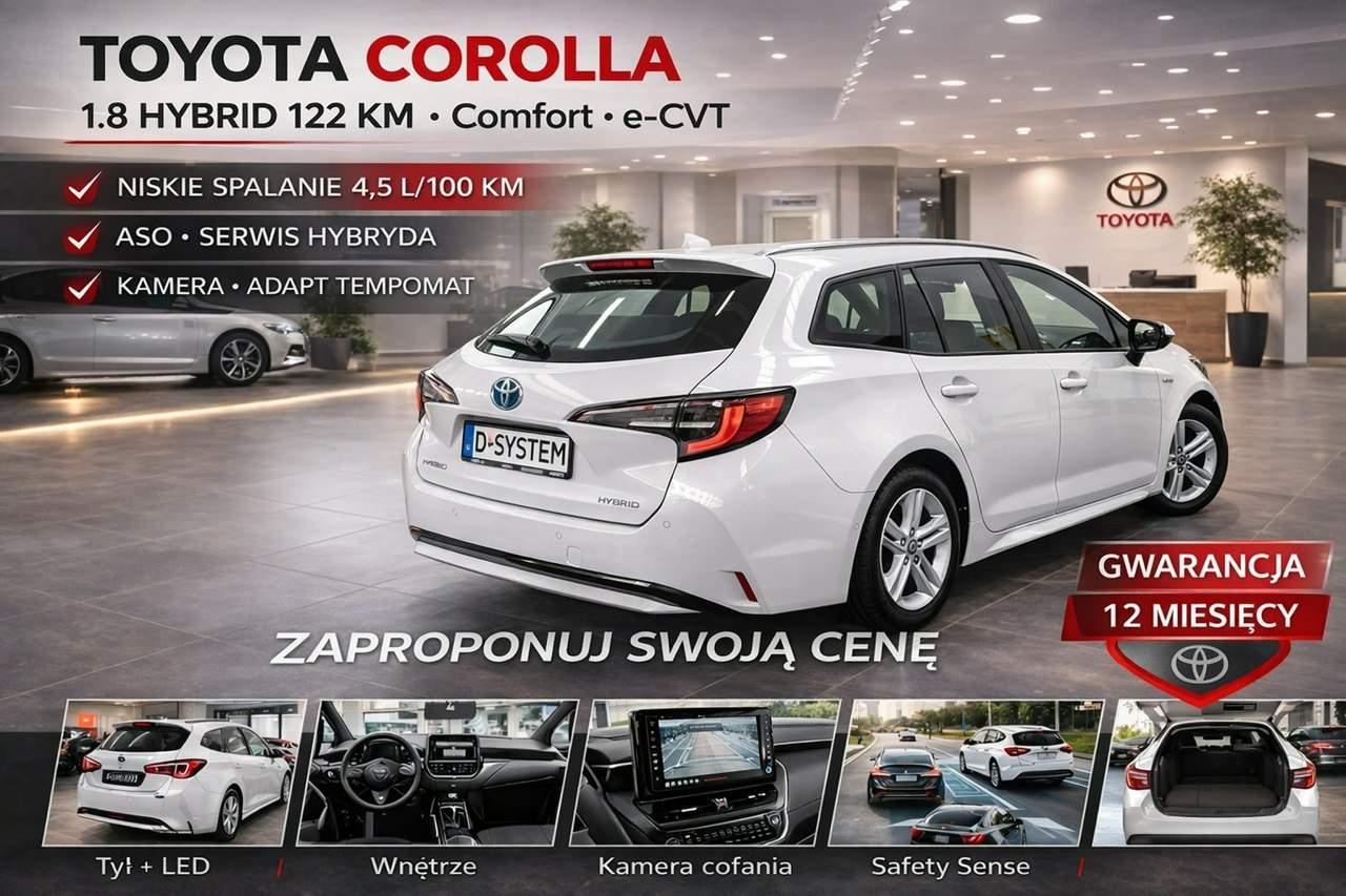 D-SYSTEM Dealer Samochodów z Polskich Salonów SPRZEDAJEMY AUTA Z GWARANCJĄ PRZEBIEGU, JAKOŚCI I POCHODZENIA. TYLKO SALON POLSKA DZWOŃ CODZIENNIE OD 8:00 DO 20:00 - NAWET W WEEKENDY I ŚWIĘTA TOYOTA Corolla Pakiet Tech 21r Salon Polska 1.8 HYBRID 122km VIN SB1Z93BE20E244456 Rejestracja WE4K866 Pierwsza rejestracja 28.09.2021 *1.8 HYBRID *98 kony+silnik elektryczny 24 konie*122 konie rozrząd na łańcuchu* **** UWAGA. !!!! **** SALON POLSKA ***** Bezwypadkowy Opony 3,0 mm Pirelli 205/55 R 16 94 V Zimowe ZAPROPONUJ SWOJĄ CENĘ SMS* Udokumentowany przebieg naszych samochodów (umieszczamy przebieg auta na fakturze VAT); W naszych ogłoszeniach zawsze jest dostępny numer VIN pojazdu; Sprzedawane przez nas auta chętnie udostępniamy do sprawdzenia w ASO; Oferujemy możliwość wykupu przedłużonej gwarancji nawet do 2 lat; Auto w bardzo dobrym stanie technicznym jak i wizualnym.. Wnętrze czyste, zadbane Technicznie 100% sprawne! Od początku serwisowany w autoryzowanym salonie Jeden właściciel. 100% pewne auto. Możliwość finansowania- Sprzedaż w oparciu o fakturę VAT, kupujący zwolniony z opłaty skarbowej 2% Atrakcyjny kredyt i leasing na preferencyjnych warunkach Przy zakupie auta dodatkowa zniżka na ubezpieczenie komunikacyjne od 18 % Oferujemy ubezpieczenia następujących towarzystw: UNIQA W przypadku finansowania zewnętrznego pobierana jest opłata administracyjna Ogłoszenie ma charakter informacyjny – w razie nieścisłości prosimy o kontakt. Przy zakupie każdy klient ma możliwość sprawdzenia pojazdu w autoryzowanym Serwisie ASO lub Stacji Kontroli Odległość nie stanowi dla nas jakiegokolwiek problemu – ZAKUPU SAMOCHODU DOKONASZ BEZ WYCHODZENIA Z DOMU! ----- --- UWAGA ------- PRZED PRZYJAZDEM PROSZĘ DZWONIĆ, -519,302,947- FIRMA NIE MA UNORMOWANEGO CZASU PRACY, DZWOŃ CODZIENNIE OD 8:00 DO 20:00 - NAWET W WEEKENDY I ŚWIĘTA Serdecznie zapraszamy Inteligentne wycieraczki z czujnikiem deszczu – Automatycznie ściemniające się lusterko wsteczne – Przednie i tylne czujniki parkowania – Elektrycznie składane lusterka zewnętrzne – Podgrzewane fotele przednie – Elektryczna regulacja podparcia odcinka lędźwiowego fotela kierowcy !!! Serdecznie zapraszamy !!! ABS Tak Relingi Tak Szyby elektryczne przod Tak Szyby elektryczne tyl Tak Tempomat Tak Fotele przednie podgrzewane Tak Czujniki parkowania przednie Tak Czujniki parkowania tylne Tak Wspomaganie kierownicy Tak Typ klimatyzacji Klimatyzacja automatyczna Kamera cofania Tak Adaptacyjny tempomat Tak Typ reflektorów Światła przednie LED Rodzaj tapicerki Tkanina 2023/07/07 25100 KM / Przegląd okresowy / Pióra wycieraczek /gumki / Płyn hamulcowy - wymiana / Filtr pyłkowy 2023/08/21 26525 KM / Bateria pilota 2023/08/29 30469 KM / Płyn hamulcowy - wymiana / Filtr pyłkowy / Dezynfekcja klimatyzacji / Przegląd TOYOTA 2023/12/04 46773 KM / Przegląd okresowy / Pióra wycieraczek /gumki / Filtr pyłkowy 2024/04/15 62929 KM / Przegląd okresowy / Pióra wycieraczek /gumki / Płyn hamulcowy - wymiana / Filtr powietrza 2024/05/08 63301 KM / Lusterko zewnętrzne - uszkodzone 2024/08/21 79253 KM / Filtr pyłkowy /Przegląd TOYOTA 2024/10/17 81552 KM / Badanie Przegląd 2024/11/27 29918 KM/ Przegląd okresowy / Płyn hamulcowy -wymiana / Filtr pyłkowy / Dezynfekcja klimatyzacji 2025/01/22 92702 KM / Przegląd okresowy / Płyn hamulcowy -wymiana / Świece zapłonowe 2025/08/13 115954 KM / Przegląd okresowy / Filtr pyłkowy /Dezynfekcja klimatyzacji / Filtr powietrza 2026/01/09 132215 KM / Przegląd okresowy Serdecznie zapraszamy !!! ZAPROPONUJ SWOJĄ CENĘ SMS* Serdecznie zapraszamy !!! Numer oferty: AKL18HK33 i00586752018i