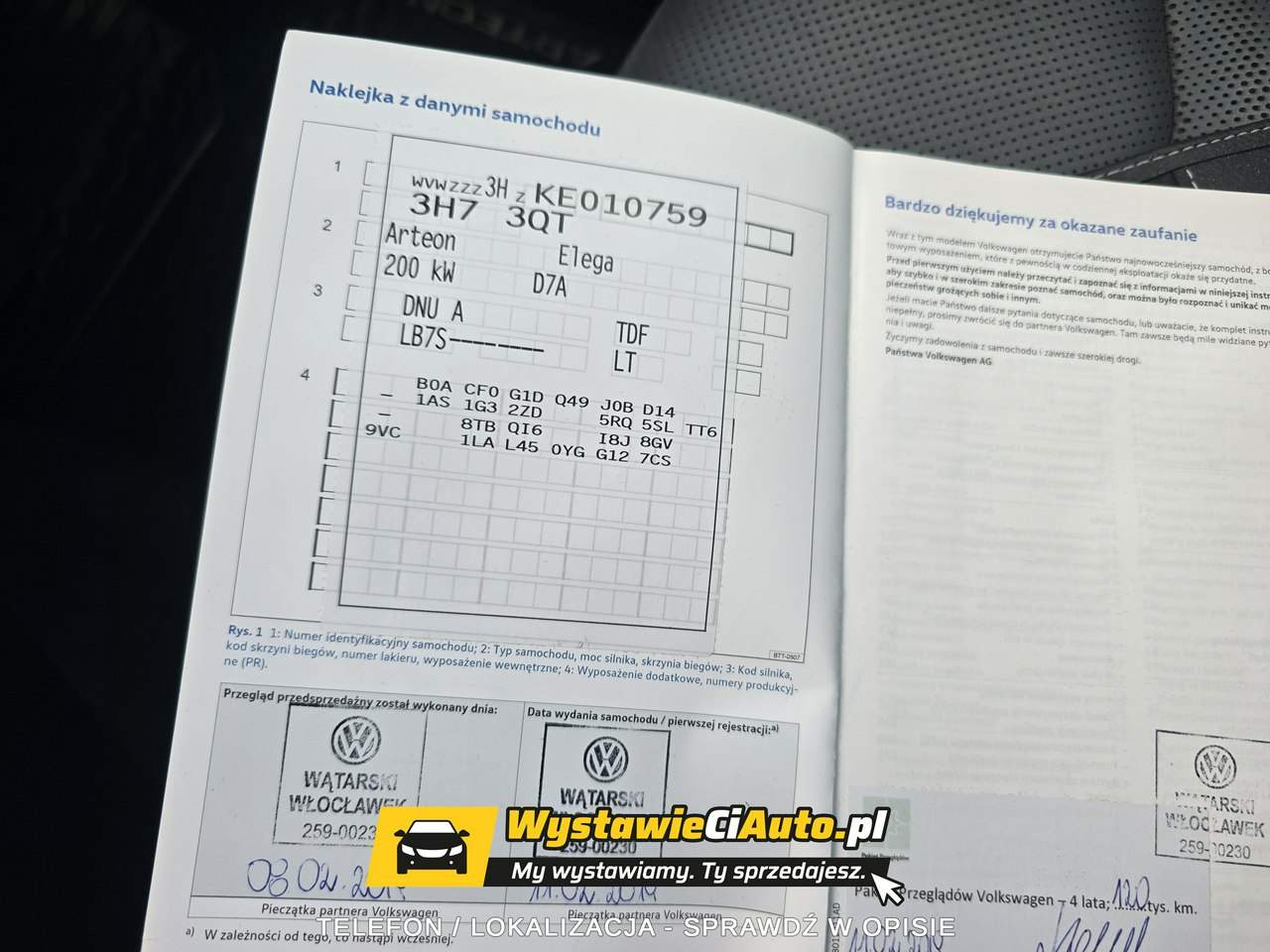 Ogłoszenie opublikowane dzięki WystawieCiAuto pl - My wystawiamy, Ty sprzedajesz. Twoje auto na wielu portalach jednym kliknięciem. Zwiększ zasięg i szanse na sprzedaż! Bezpośredni kontakt z właścicielem pod numerem telefonu: 515_037_400 Osoba kontaktowa: Krzysztof Lokalizacja pojazdu: Włocławek (województwo: kujawsko-pomorskie, kod pocztowy: 87-800) Opis właściciela: Na sprzedaż oferuję wyjątkowego Volkswagena Arteona w prestiżowej wersji Elegance, wyposażonego w dynamiczny i niezawodny silnik 2.0 TSI o mocy 280 KM oraz napęd 4Motion, który zapewnia świetną trakcję i pewność prowadzenia w każdych warunkach. Auto zostało kupione w polskim salonie WĄTARSKI WŁOCŁAWEK i od nowości jest w rękach jednego właściciela. Samochód jest serwisowany w ASO, posiada pełną historię serwisową oraz książkę serwisową. Przebieg 273 000 km jest w pełni udokumentowany i pokonany głównie w trasie. Dodatkowo już jako nowe auto zostało profesjonalnie wygłuszone w firmie Ciche-Auto, co znacząco podnosi komfort jazdy. Najważniejsze informacje: Rok produkcji: 2019 Data 1. rejestracji: 11.02.2019 VIN: WVWZZZ3HZKE010759 Silnik: 2.0 TSI 280 KM Napęd: 4Motion (4x4) Skrzynia biegów: automatyczna DSG Przebieg: 273 000 km (udokumentowany) Pochodzenie: salon Polska Pierwszy właściciel Wyposażenie: Head-Up Display Virtual Cockpit (cyfrowe zegary) System monitorowania martwego pola Skórzana tapicerka Hak holowniczy elektryczny Elektrycznie regulowane fotele z pamięcią Podgrzewane i wentylowane fotele przednie Fotel kierowcy z funkcją masażu Podgrzewana tylna kanapa Nagłośnienie DYNAUDIO Podgrzewana kierownica 3-strefowa klimatyzacja automatyczna System wyboru trybów jazdy Webasto sterowane z telefonu Android Auto / Apple CarPlay Kamera cofania Czujniki parkowania przód + tył Alufelgi 20” Auto zadbane, użytkowane głównie w trasie, co ma ogromne znaczenie dla jego kondycji technicznej. Silnik, skrzynia oraz napęd pracują bardzo dobrze, a samochód jest gotowy do dalszej eksploatacji bez dodatkowych nakładów. Egzemplarz godny polecenia – pewne pochodzenie, jeden właściciel i pełna historia serwisowa. Więcej informacji pod podanym numerem telefonu. Cena: 74.900 brutto do negocjacji. Na samochód jest wystawiana Faktura VAT 23%. Bezpośredni kontakt z właścicielem pod numerem telefonu: 515_037_400 Osoba kontaktowa: Krzysztof Lokalizacja pojazdu: Włocławek (województwo: kujawsko-pomorskie, kod pocztowy: 87-800) Ogłoszenie opublikowane dzięki WystawieCiAuto pl - My wystawiamy, Ty sprzedajesz. Twoje auto na wielu portalach jednym kliknięciem. Zwiększ zasięg i szanse na sprzedaż! Numer oferty: AKL18HWJW i00586869711i