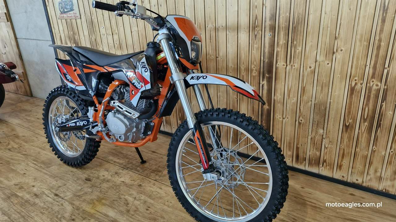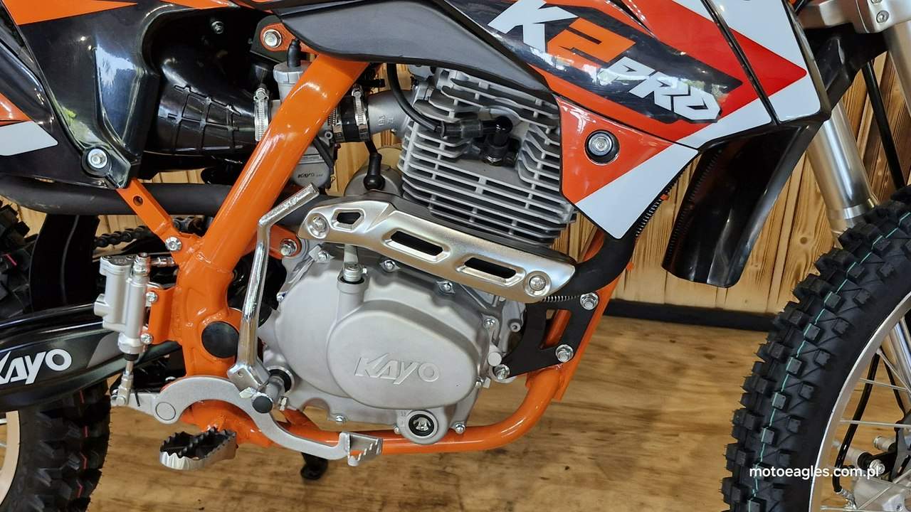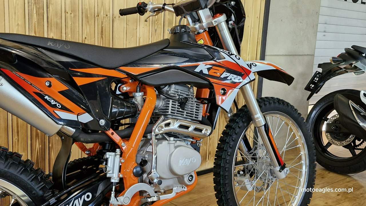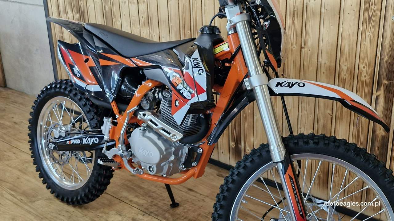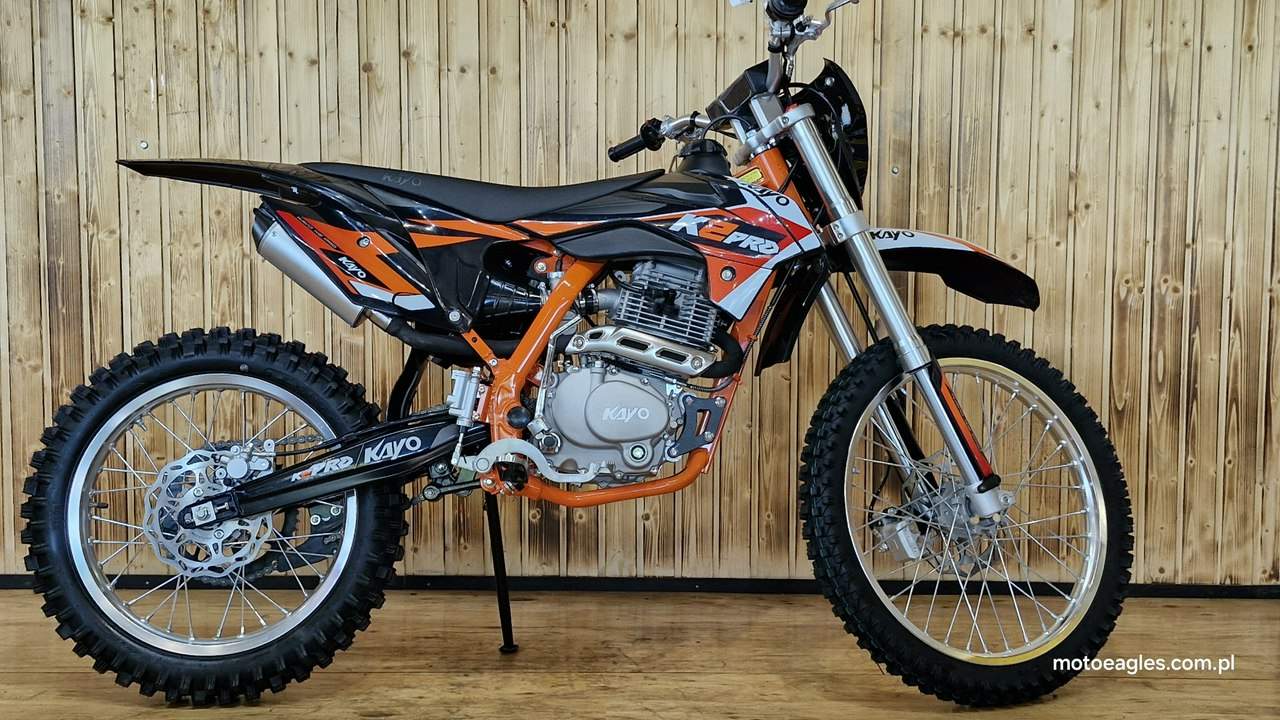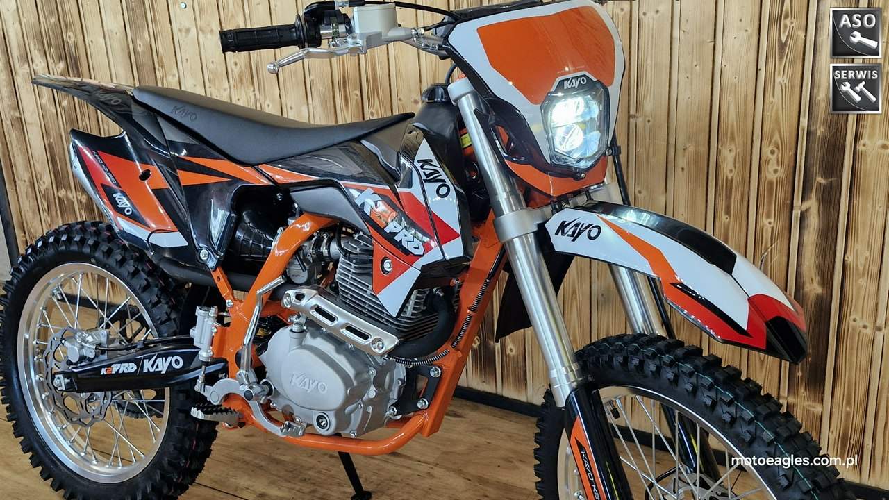 Witamy serdecznie! JESTEŚ NA STRONIE SALONU MOTOCYKLOWEGO"MOTOEAGLES" Zapraszamy do naszego autoryzowanego salonu i serwisu marki KAYO – prawdziwej oazie dla miłośników motocykli! Oto kilka powodów, dla których warto wybrać naszą ofertę: 1. **Innowacyjność** : Produkty marki KAYO to połączenie najnowszych technologii z pasją do motocykli. Oferujemy Ci dostęp do nowoczesnych rozwiązań, które zapewniają niezapomniane wrażenia z jazdy. 2. **Wysoka jakość**: Każdy motocykl i część marki KAYO to gwarancja solidności wykonania i trwałości. Dzięki temu możesz cieszyć się nie tylko świetnym designem, ale także pewnością co do bezpieczeństwa i niezawodności sprzętu. 3. **Kompleksowa obsługa** : Nasz autoryzowany salon oferuje nie tylko sprzedaż, ale także kompleksową obsługę serwisową. Nasi wykwalifikowani specjaliści zadbasz o Twój motocykl, zapewniając mu długą żywotność i bezproblemową eksploatację. Posiadamy części w zakresie eksploatacji, a także szkodowe. 4. **Bogata oferta** Bez względu na to, czy szukasz motocykla buggy czy quada, marka KAYO ma dla Ciebie idealne rozwiązanie. Nasze produkty są dopasowane do różnych stylów jazdy i oczekiwań klientów. 5. **Profesjonalne doradztwo** Nasz zespół z pasją podzieli się z Tobą swoją wiedzą i doświadczeniem, pomagając Ci wybrać najlepszy model motocykla lub akcesoriów pasujących do Twoich potrzeb i preferencji. Nie czekaj dłużej! Odwiedź nasz salon i przekonaj się, dlaczego marka KAYO to świetny wybór dla każdego motocyklisty. Czekamy na Ciebie z otwartymi drzwiami i gotowi sprostać Twoim oczekiwaniom! KAYO to marka ,która jest najlepsza jakościowo porównując oferty produktów ze wschodu, trzymając przy tym niskie ceny. PREZENTUJEMY: DIRT BIKE KAYO K2pro ENDURO Jeżeli szukasz lekkiego i wytrzymałego sprzętu do jazdy w terenie, to Kayo K2 Enduro jest doskonałym wyborem. Duży zbiornik paliwa i wygodna kanapa pozwolą na przejechanie wielu kilometrów. Przednia lampa umożliwia jazdę również po zmroku. Motocykl jest przeznaczony dla młodzieży w wieku od 14 lat oraz dla dorosłych. Dzięki niemu przygoda zaczyna się tam, gdzie dla wielu innych się kończy. Silnik o pojemności 249 cm3 generuje dużą moc, co przy niskiej masie zaledwie 105 kg zapewnia ponadprzeciętne osiągi. Manualna, pięciostopniowa skrzynia biegów pozwoli dobrać optymalne przełożenie w każdych warunkach. Lekkie i mocne aluminiowe koła o średnicy 21 cali z przodu i 18 cali z tyłu pomogą wjechać w każdy teren dzięki wysokiej jakości oponom z wysokim bieżnikiem. Kickstarter i rozrusznik elektryczny to doskonałe połączenie. Możesz wymontować akumulator i nadal cieszyć się jazdą, a przy okazji zmniejszyć masę motocykla. Z przednią lampą nadejście zmroku nie oznacza końca zabawy. Wysokiej jakości reflektor skutecznie oświetli każdy szlak. Zbiornik paliwa ma pojemność aż 6,7 l, co w połączeniu z ekonomicznym silnikiem sprawia, że rzadko będziesz robić przystanki na tankowanie. Hydrauliczne hamulce tarczowe z tarczami o średnicy 240 mm z przodu i 220 mm z tyłu zapewniają niezawodną i mocną siłę hamowania. Wszystkie pojazdy objęte są gwarancją producenta. Sprzedawcy pomogą w doborze niezbędnego wyposażenia motocyklisty i doradzą, jak serwisować Kayo (to proste i niedrogie!). Dla kogo jest dirt bike Kayo K2 Enduro? Motocykl jest idealny dla młodzieży i dorosłych, którzy lubią eksplorować bezdroża. To propozycja dla wymagających, ceniących wygodę i lubiących długie przejażdżki riderów. Oprócz komfortu głównymi zaletami są również wysoka jakość wykonania i łatwość obsługi. Czym różni się Kayo K2 Enduro od Kayo T4 Enduro? Kayo K2 Enduro posiada o 3,5 cm niżej siedzenie od modelu T4 Enduro, które znajduje się na wysokości 89 cm. Dodatkowo, K2 wyposażono w elektryczny starter oraz tradycyjny kickstarter (w T4 tylko e-start). Model K2 jest także tańszy. Czy jazda na dirt bike jest bezpieczna? Stopień bezpieczeństwa zależy od wybranego szlaku. Należy mierzyć siły na zamiary i doskonalić swoje umiejętności. Przed wyruszeniem w drogę pamiętaj o założeniu odpowiedniej odzieży ochronnej i kasku spełniającego normę bezpieczeństwa ECE. Dane techniczne Pojemność (cm3): 249 cm3 Typ silnika: jednocylindrowy; 4-suw; chłodzony powietrzem Moc 16,3KM przy 7500rpm Stop sprężania: 9.0:1 Zapłon: CDI standard z ładowaniem Rozruch: kickstarter + rozrusznik Skrzynia: manualna; 5-biegowa Sprzęgło: manualne Wysokość siedzenia (mm): 890 Wymiary: 2000 × 1150 × 490 Waga (kg): 105 Paliwo: PB 95 Pojemność zbiornika (l): 6,7 Gaźnik: NIBBI PE28 Rozmiar filtr: ∅ 50mm Olej silnikowy (ml): 10w40 dla motocykli 4T +/- 900 ml Rozstaw osi: 1340mm Koło przód: 21″ aluminiowe Koło tył: 18″ aluminiowe Roz. opon: przód 80/100-21; tył 110/90-18 Zawieszenie przód: 800mm nieregulowane USD Zawieszenie tył: 360mm Prześwit: 350mm Hamulce (ilość tłoczków): Przód – 2 tłoczki; Tył 1 tłoczek Zalecany wiek: od 14 lat Uwagi posiada przednią lampę posiada stopkę boczną Zapraszamy do salonu znajdującego się w Bicz 9A , 62-571 Numer oferty: MKM45CP6 i00586075409i