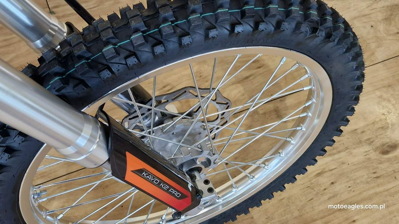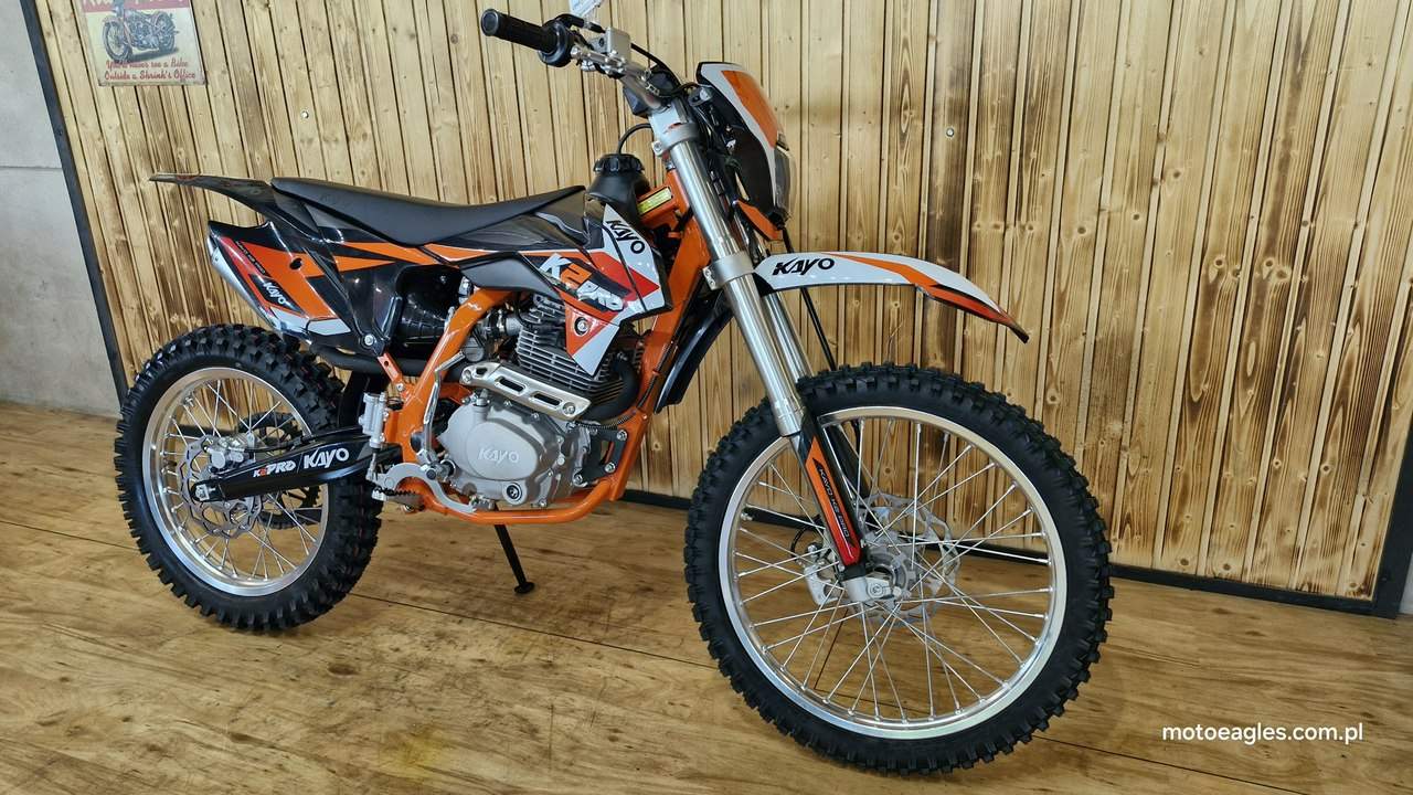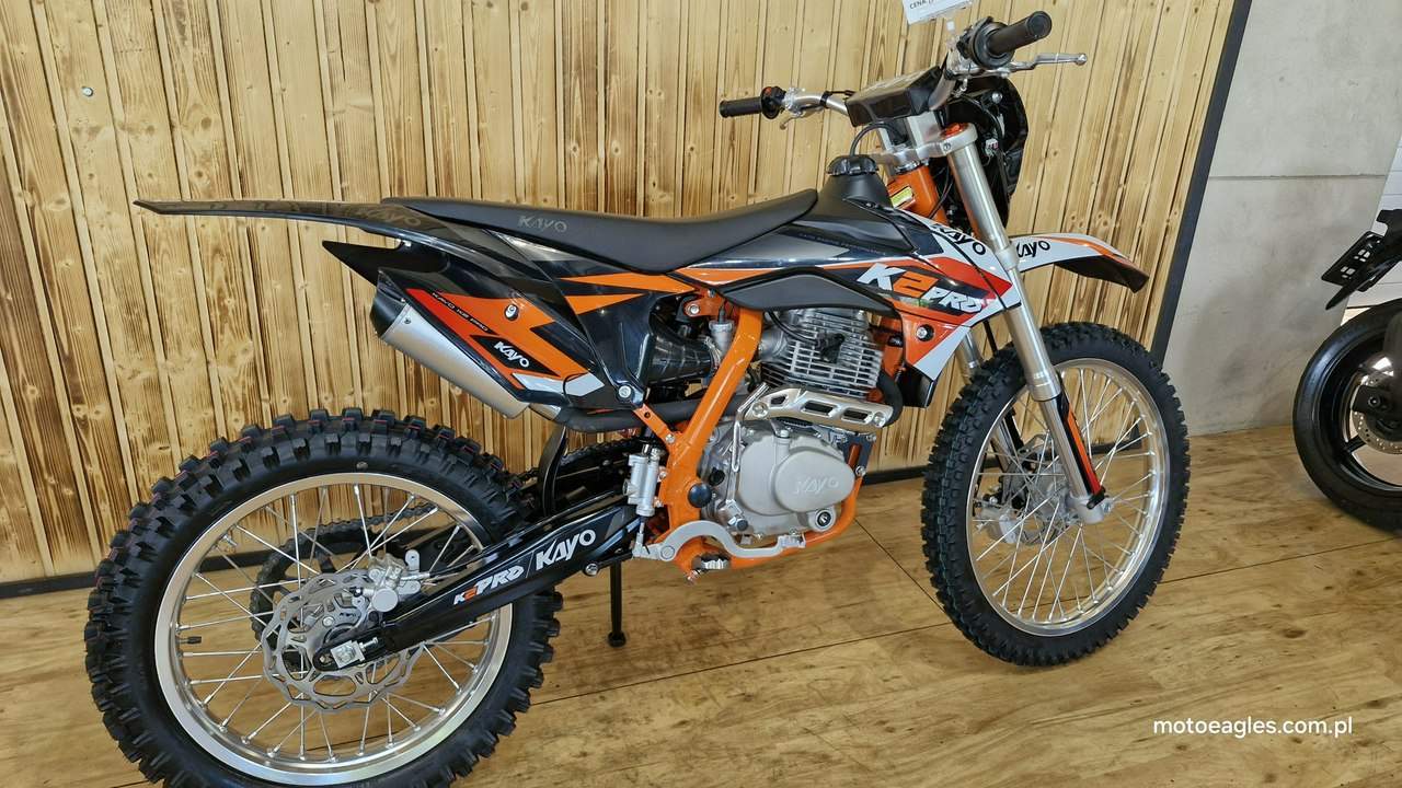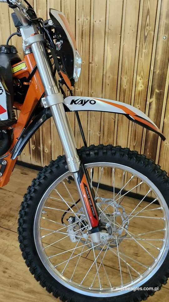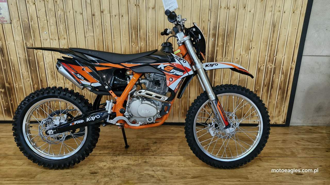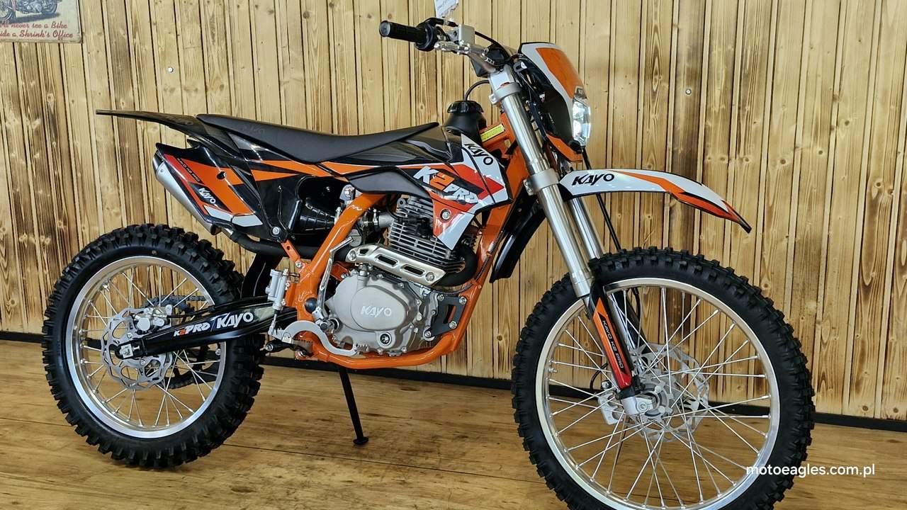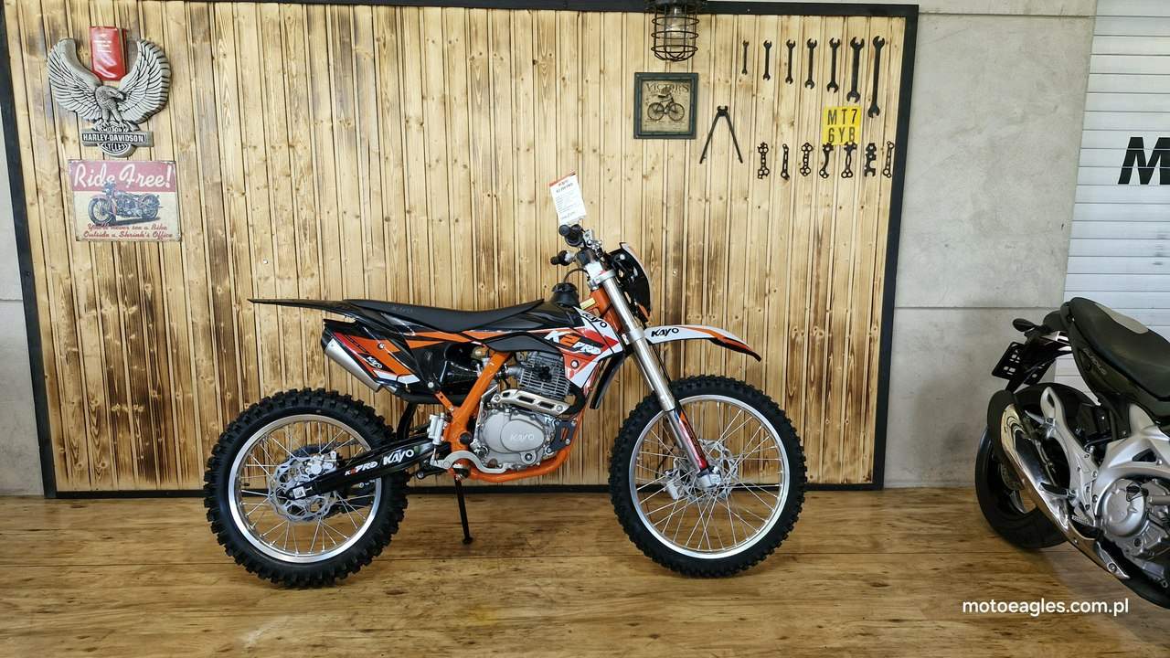 Witamy serdecznie! JESTEŚ NA STRONIE SALONU MOTOCYKLOWEGO"MOTOEAGLES" Zapraszamy do naszego autoryzowanego salonu i serwisu marki KAYO – prawdziwej oazie dla miłośników motocykli! Oto kilka powodów, dla których warto wybrać naszą ofertę: 1. **Innowacyjność** : Produkty marki KAYO to połączenie najnowszych technologii z pasją do motocykli. Oferujemy Ci dostęp do nowoczesnych rozwiązań, które zapewniają niezapomniane wrażenia z jazdy. 2. **Wysoka jakość**: Każdy motocykl i część marki KAYO to gwarancja solidności wykonania i trwałości. Dzięki temu możesz cieszyć się nie tylko świetnym designem, ale także pewnością co do bezpieczeństwa i niezawodności sprzętu. 3. **Kompleksowa obsługa** : Nasz autoryzowany salon oferuje nie tylko sprzedaż, ale także kompleksową obsługę serwisową. Nasi wykwalifikowani specjaliści zadbasz o Twój motocykl, zapewniając mu długą żywotność i bezproblemową eksploatację. Posiadamy części w zakresie eksploatacji, a także szkodowe. 4. **Bogata oferta** Bez względu na to, czy szukasz motocykla buggy czy quada, marka KAYO ma dla Ciebie idealne rozwiązanie. Nasze produkty są dopasowane do różnych stylów jazdy i oczekiwań klientów. 5. **Profesjonalne doradztwo** Nasz zespół z pasją podzieli się z Tobą swoją wiedzą i doświadczeniem, pomagając Ci wybrać najlepszy model motocykla lub akcesoriów pasujących do Twoich potrzeb i preferencji. Nie czekaj dłużej! Odwiedź nasz salon i przekonaj się, dlaczego marka KAYO to świetny wybór dla każdego motocyklisty. Czekamy na Ciebie z otwartymi drzwiami i gotowi sprostać Twoim oczekiwaniom! KAYO to marka ,która jest najlepsza jakościowo porównując oferty produktów ze wschodu, trzymając przy tym niskie ceny. PREZENTUJEMY: DIRT BIKE KAYO K2pro ENDURO Jeżeli szukasz lekkiego i wytrzymałego sprzętu do jazdy w terenie, to Kayo K2 Enduro jest doskonałym wyborem. Duży zbiornik paliwa i wygodna kanapa pozwolą na przejechanie wielu kilometrów. Przednia lampa umożliwia jazdę również po zmroku. Motocykl jest przeznaczony dla młodzieży w wieku od 14 lat oraz dla dorosłych. Dzięki niemu przygoda zaczyna się tam, gdzie dla wielu innych się kończy. Silnik o pojemności 249 cm3 generuje dużą moc, co przy niskiej masie zaledwie 105 kg zapewnia ponadprzeciętne osiągi. Manualna, pięciostopniowa skrzynia biegów pozwoli dobrać optymalne przełożenie w każdych warunkach. Lekkie i mocne aluminiowe koła o średnicy 21 cali z przodu i 18 cali z tyłu pomogą wjechać w każdy teren dzięki wysokiej jakości oponom z wysokim bieżnikiem. Kickstarter i rozrusznik elektryczny to doskonałe połączenie. Możesz wymontować akumulator i nadal cieszyć się jazdą, a przy okazji zmniejszyć masę motocykla. Z przednią lampą nadejście zmroku nie oznacza końca zabawy. Wysokiej jakości reflektor skutecznie oświetli każdy szlak. Zbiornik paliwa ma pojemność aż 6,7 l, co w połączeniu z ekonomicznym silnikiem sprawia, że rzadko będziesz robić przystanki na tankowanie. Hydrauliczne hamulce tarczowe z tarczami o średnicy 240 mm z przodu i 220 mm z tyłu zapewniają niezawodną i mocną siłę hamowania. Wszystkie pojazdy objęte są gwarancją producenta. Sprzedawcy pomogą w doborze niezbędnego wyposażenia motocyklisty i doradzą, jak serwisować Kayo (to proste i niedrogie!). Dla kogo jest dirt bike Kayo K2 Enduro? Motocykl jest idealny dla młodzieży i dorosłych, którzy lubią eksplorować bezdroża. To propozycja dla wymagających, ceniących wygodę i lubiących długie przejażdżki riderów. Oprócz komfortu głównymi zaletami są również wysoka jakość wykonania i łatwość obsługi. Czym różni się Kayo K2 Enduro od Kayo T4 Enduro? Kayo K2 Enduro posiada o 3,5 cm niżej siedzenie od modelu T4 Enduro, które znajduje się na wysokości 89 cm. Dodatkowo, K2 wyposażono w elektryczny starter oraz tradycyjny kickstarter (w T4 tylko e-start). Model K2 jest także tańszy. Czy jazda na dirt bike jest bezpieczna? Stopień bezpieczeństwa zależy od wybranego szlaku. Należy mierzyć siły na zamiary i doskonalić swoje umiejętności. Przed wyruszeniem w drogę pamiętaj o założeniu odpowiedniej odzieży ochronnej i kasku spełniającego normę bezpieczeństwa ECE. Dane techniczne Pojemność (cm3): 249 cm3 Typ silnika: jednocylindrowy; 4-suw; chłodzony powietrzem Moc 16,3KM przy 7500rpm Stop sprężania: 9.0:1 Zapłon: CDI standard z ładowaniem Rozruch: kickstarter + rozrusznik Skrzynia: manualna; 5-biegowa Sprzęgło: manualne Wysokość siedzenia (mm): 890 Wymiary: 2000 × 1150 × 490 Waga (kg): 105 Paliwo: PB 95 Pojemność zbiornika (l): 6,7 Gaźnik: NIBBI PE28 Rozmiar filtr: ∅ 50mm Olej silnikowy (ml): 10w40 dla motocykli 4T +/- 900 ml Rozstaw osi: 1340mm Koło przód: 21″ aluminiowe Koło tył: 18″ aluminiowe Roz. opon: przód 80/100-21; tył 110/90-18 Zawieszenie przód: 800mm nieregulowane USD Zawieszenie tył: 360mm Prześwit: 350mm Hamulce (ilość tłoczków): Przód – 2 tłoczki; Tył 1 tłoczek Zalecany wiek: od 14 lat Uwagi posiada przednią lampę posiada stopkę boczną Zapraszamy do salonu znajdującego się w Bicz 9A , 62-571 Numer oferty: MKM45CP6 i00586075409i