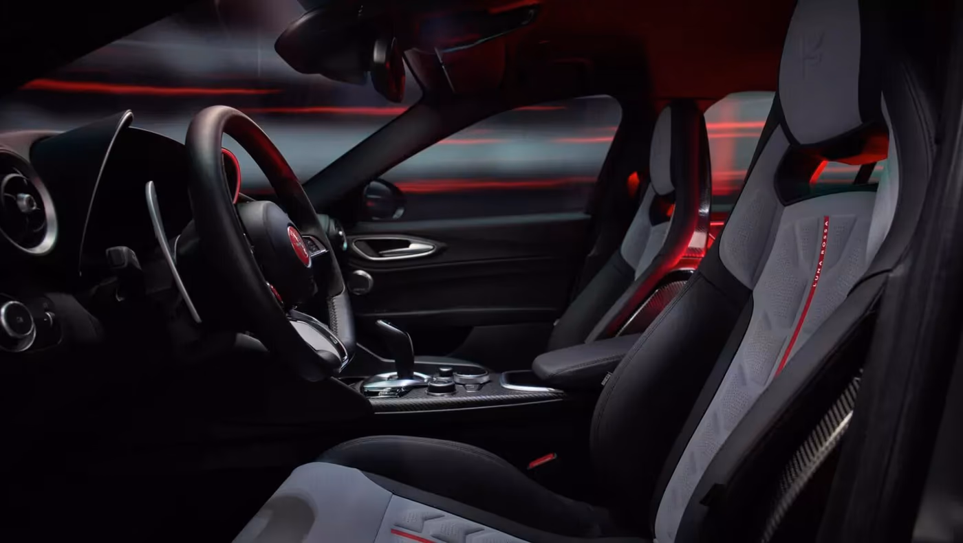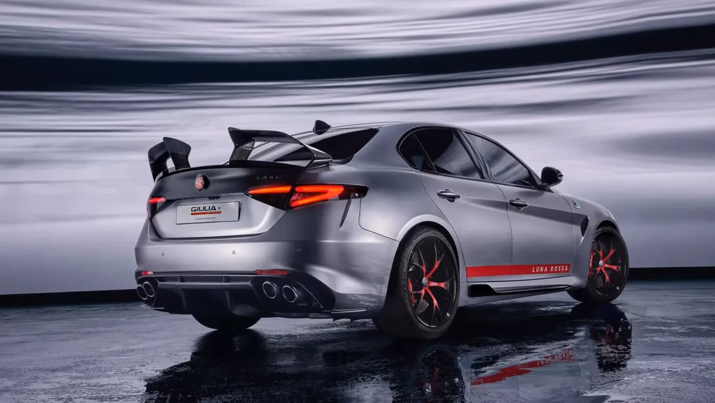 Najwięcej uwagi poświęcono aerodynamice. Przedni zderzak wyposażono w karbonowe „ducktails”, podłogę przeprofilowano tak, by generowała efekt zasysania, boczne listwy uszczelniają przepływ powietrza, a tylne skrzydło otrzymało złożoną geometrię. Przy prędkości 300 km/h zestaw wytwarza docisk rzędu 140 kg, czyli pięciokrotnie większy niż w seryjnej Giulii Quadrifoglio.