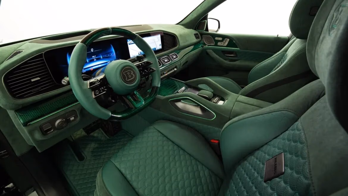Wnętrze zostało całkowicie przeprojektowane i wykończone skórą, alcantarą oraz karbonem. Zielone akcenty pojawiają się niemal w każdym elemencie kabiny – nawet na karbonowych nakładkach na pedały.