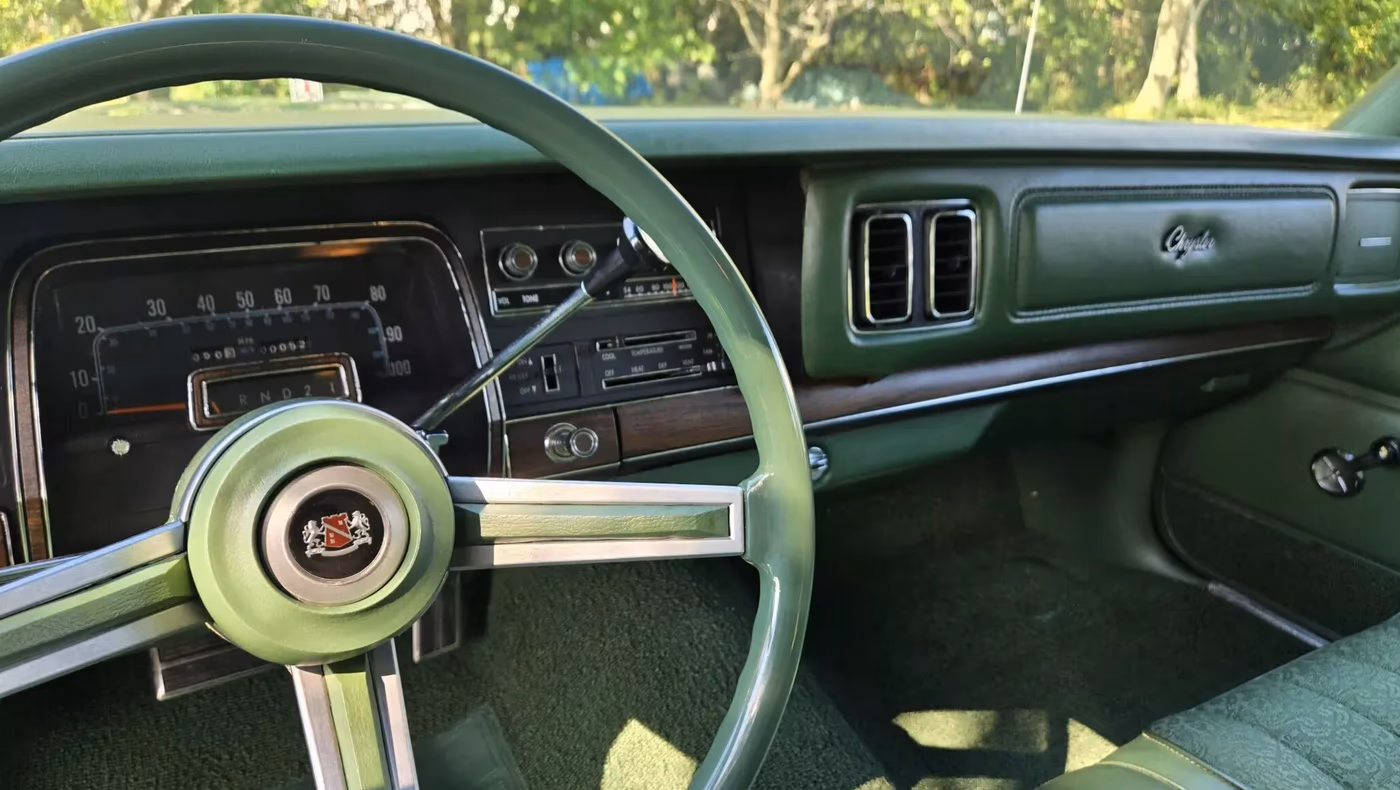Chrysler Newport zachował oryginalne wyposażenie i fabryczny stan. Lakier w kolorze nefrytowej zieleni doskonale współgra z wnętrzem utrzymanym w podobnej tonacji. Wśród dodatkowych opcji znalazły się radio oraz podgrzewana tylna szyba – elementy, za które w 1977 roku trzeba było dopłacić. Samochód stoi na 15-calowych stalowych felgach z oryginalnymi kołpakami, a pod maską pracuje ośmiocylindrowy silnik V8 o pojemności 6,6 litra i mocy około 190 KM.