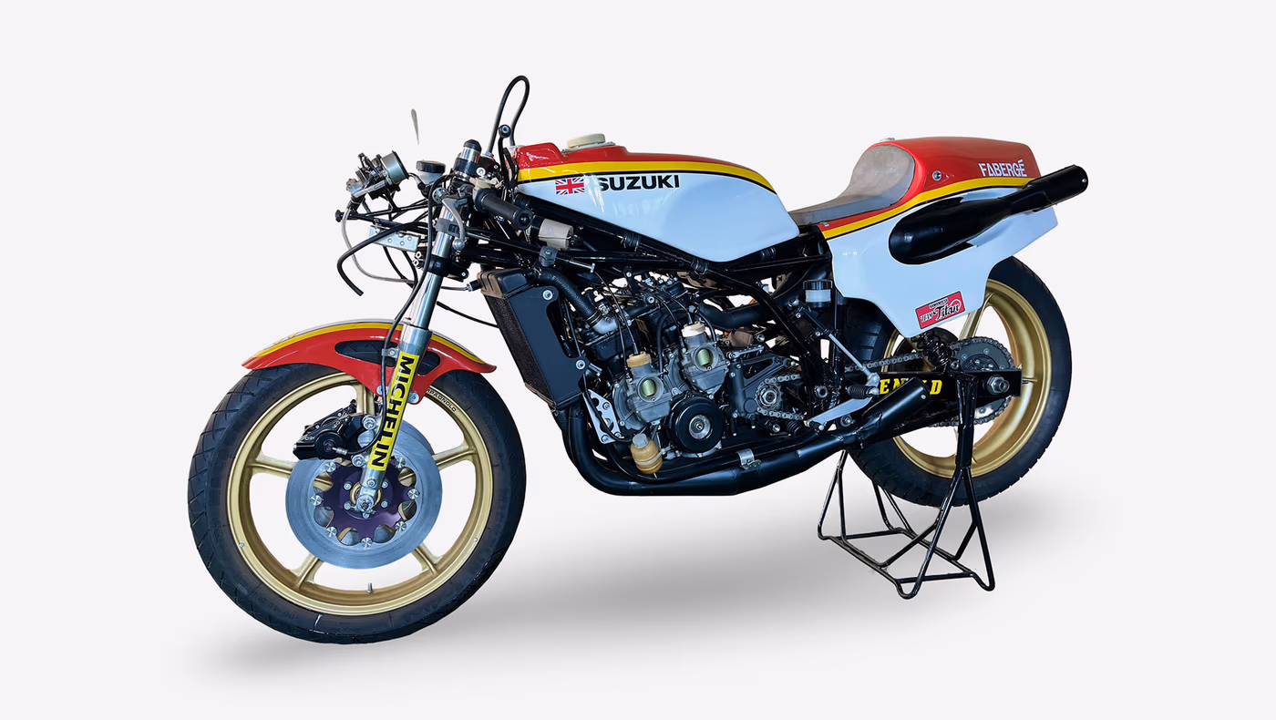 Tak wysoka wycena wynika z niezwykłej historii maszyny. W 1977 roku na tym egzemplarzu brytyjski zawodnik Barry Sheene zdobył mistrzostwo świata w wyścigach motocyklowych w klasie 500 cm³. Startując w barwach zespołu Texaco Heron Team Suzuki, wygrał sześć z jedenastu rund sezonu, a w kolejnych osiągał wysokie lokaty. Wystawiony na sprzedaż motocykl brał udział w finałowym wyścigu tamtych mistrzostw.