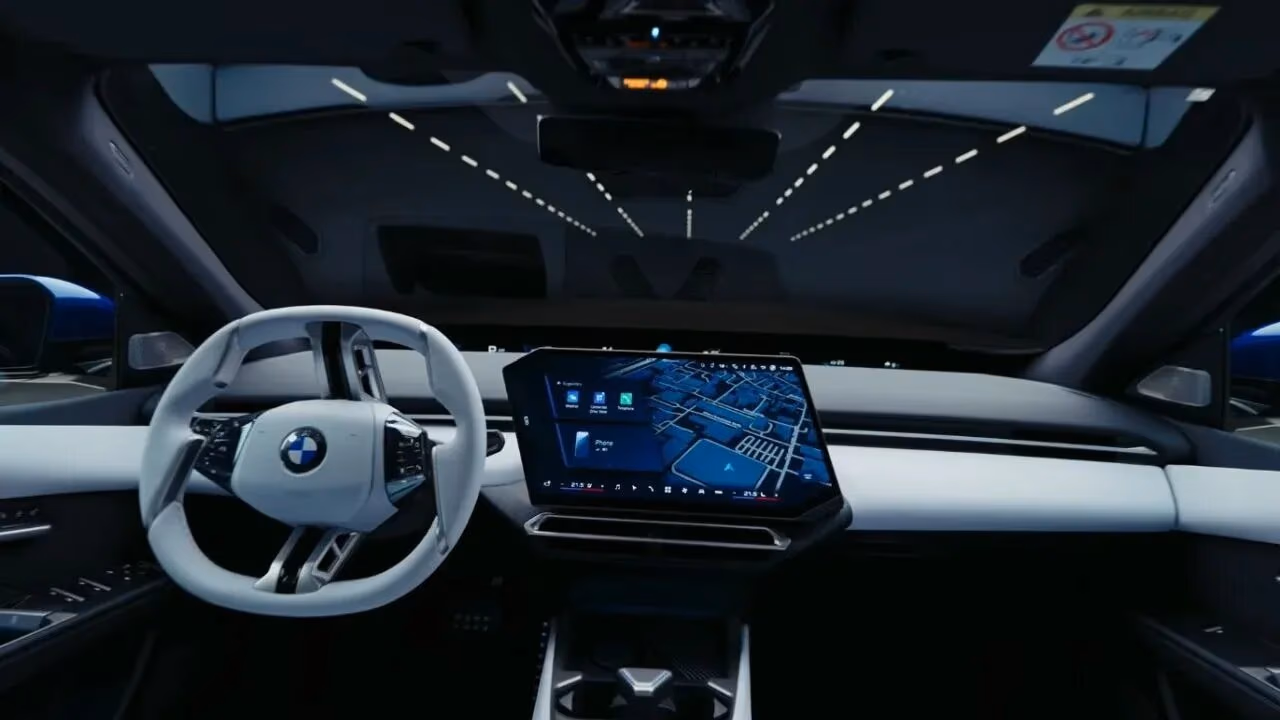 We wnętrzu znalazła się czteroramienna kierownica ze spłaszczonym wieńcem oraz centralny ekran multimedialny o trapezowym kształcie. Zamiast klasycznego zestawu wskaźników zastosowano szeroki, zakrzywiony wyświetlacz Panoramic iDrive, który rozciąga się wzdłuż dolnej części przedniej szyby i prezentuje kluczowe informacje dla kierowcy. Do wykończenia kabiny wykorzystano między innymi tkaniny oraz materiały syntetyczne.